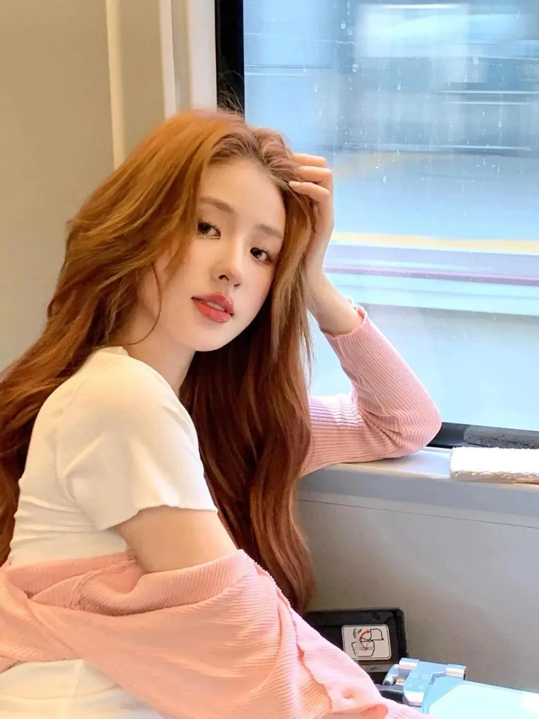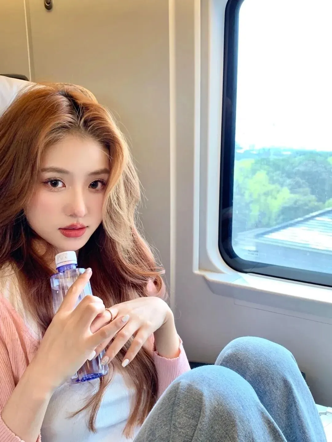 手持水瓶轻托脸颊,身体微微前倾,既解决了“手怎么放”的尴尬,又能营造慵懒的氛围感。侧光在发丝上形成的光晕,让画面自带柔光滤镜;背景的车窗线条引导视线,增加纵深感,整个画面像旅途中的片刻放空,松弛又惬意。