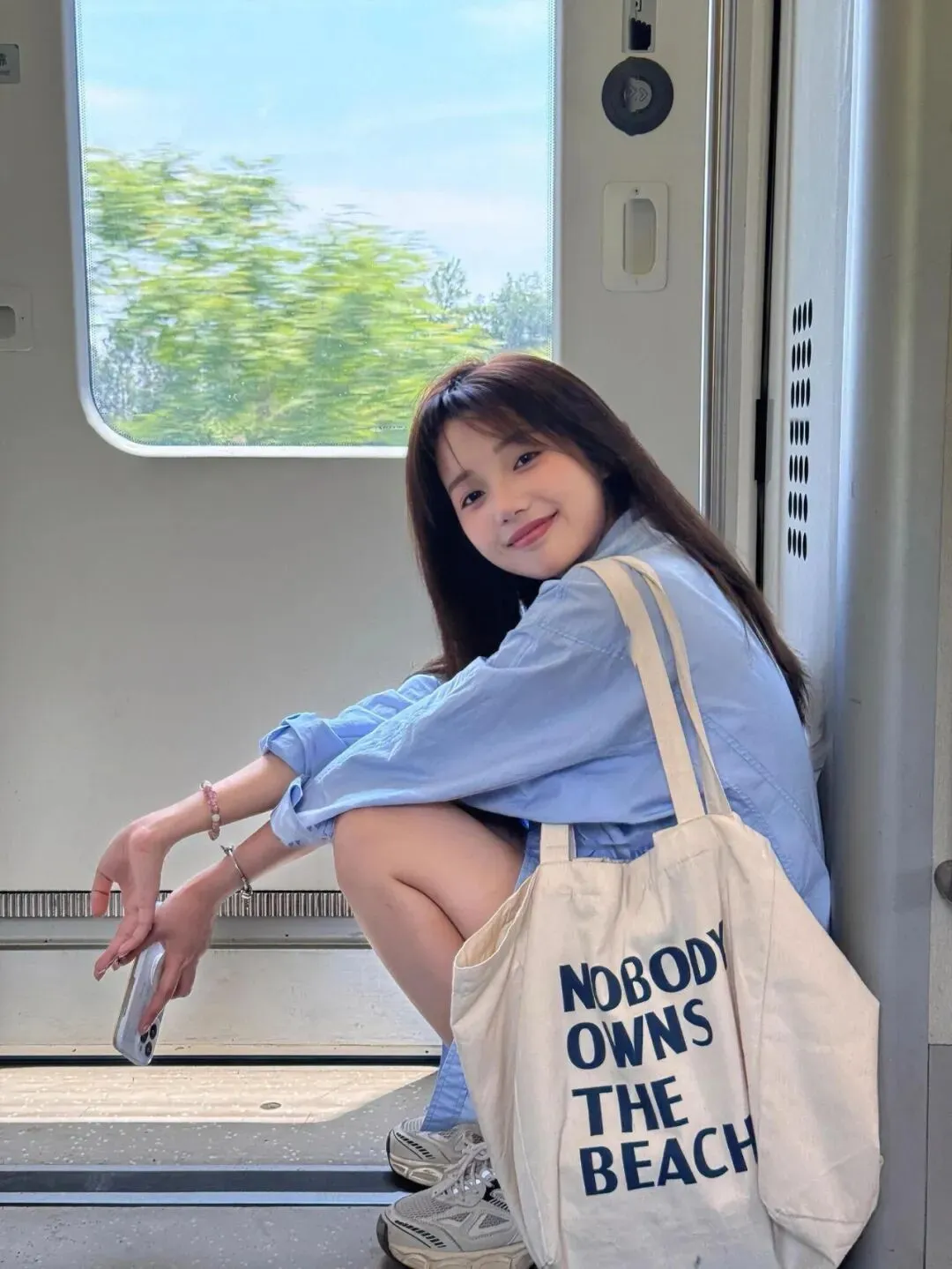 车厢连接处的角落是小众出片点!蹲坐的姿势搭配大帆布包道具,让画面更有层次感。背景的车窗与车门线条形成引导,窗外的绿色风景让画面更清新。引导模特放松肢体,自然看向镜头,整个画面像旅途中的小停顿,松弛又有故事感。