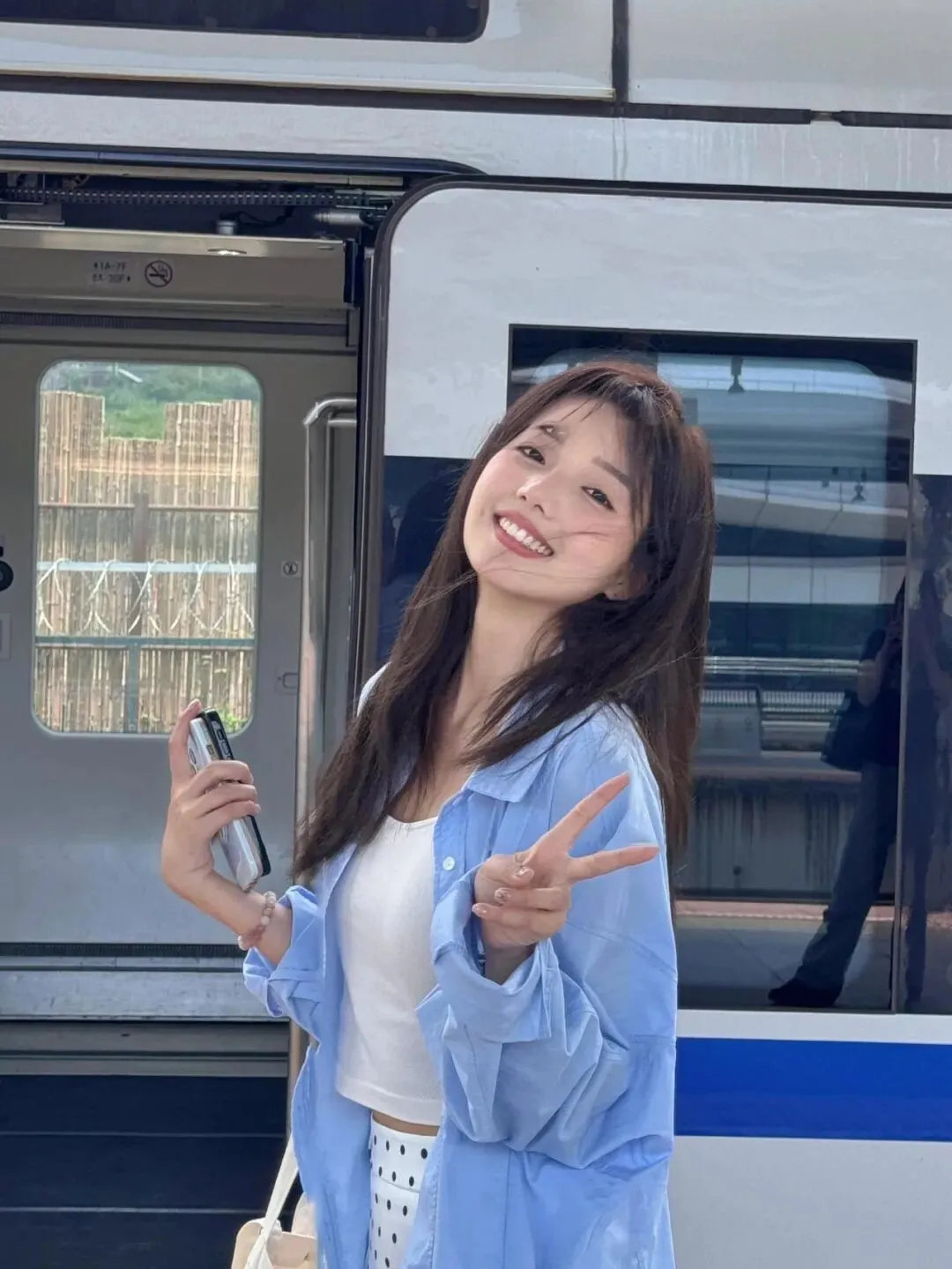 在车门前站立比耶,身体微微后仰、笑容灿烂,利用车门的框架感,让画面更有纵深感。自然光穿过车门落在身上,让肤色更通透;背景的车厢线条与窗外景色,增加了画面的氛围感,把“即将出发的快乐”拍得鲜活又动人。