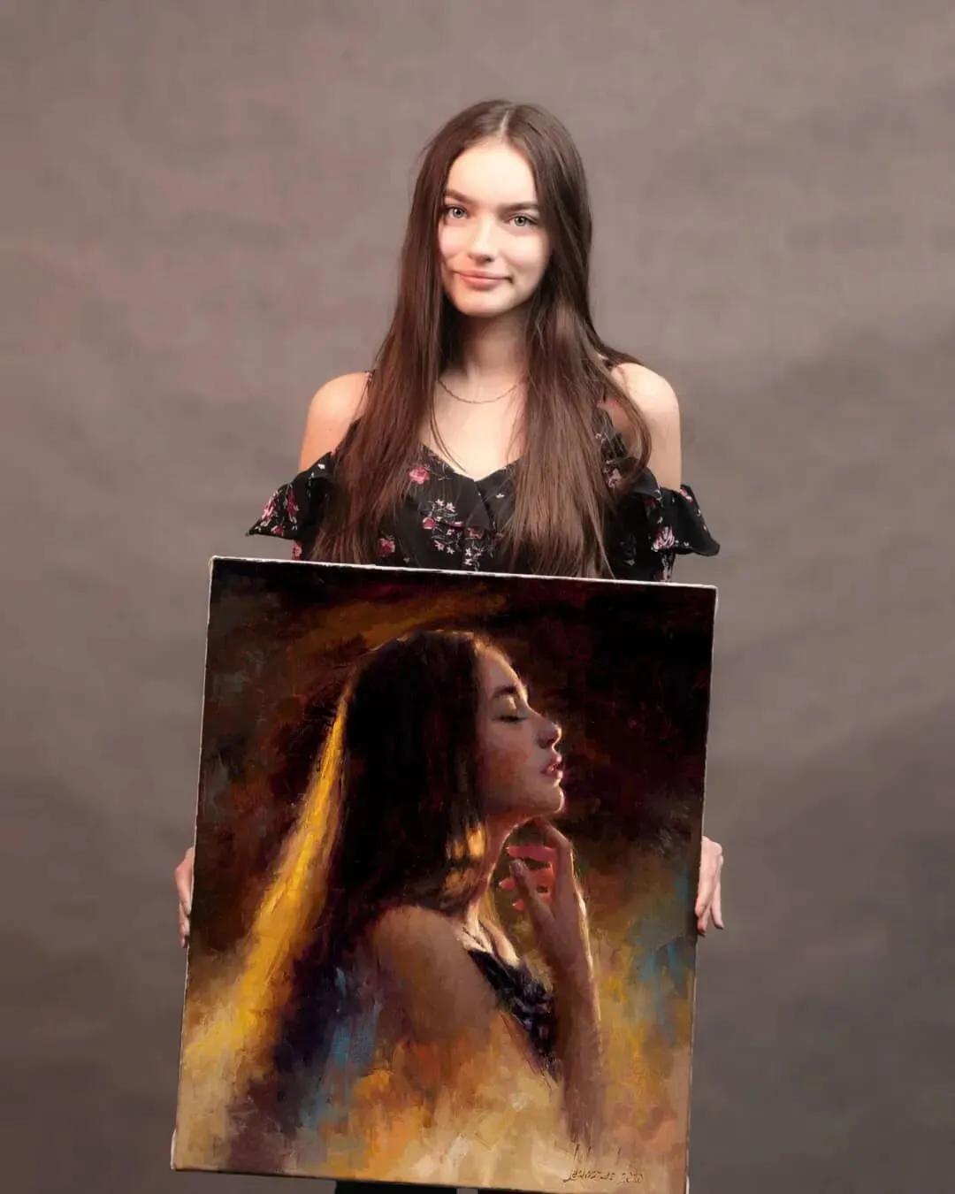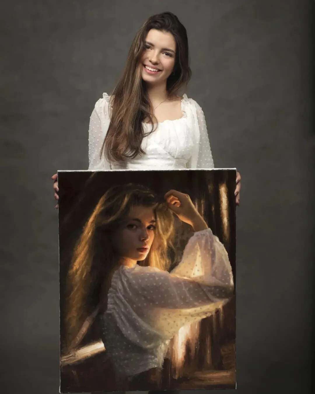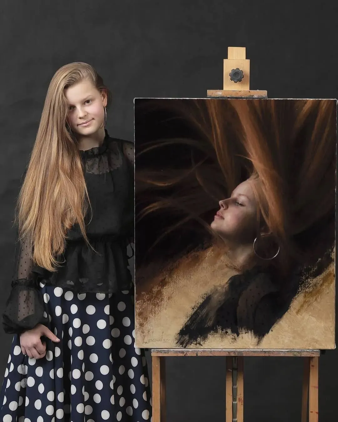 这位超写实画家擅长运用光影和色彩,通过细腻的色彩过渡,以及恰到好处的光影对比,使得画中女孩散发出古典、柔美的高雅气质,一下子将观众带进了一个怀旧的温馨氛围之中。