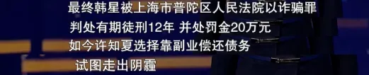 最终,韩星因为因诈骗罪,被判有期徒刑12年,并处罚金20万元。