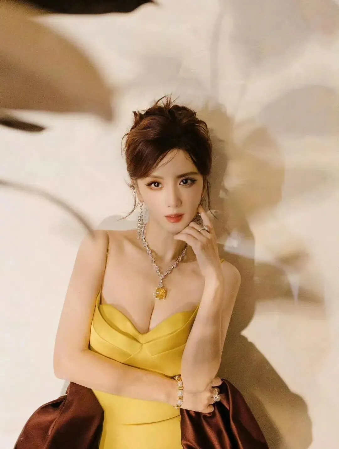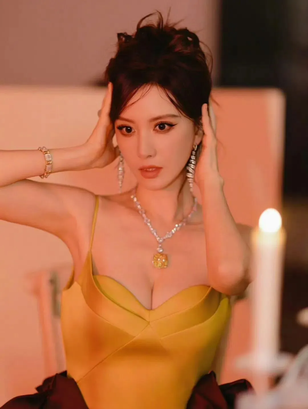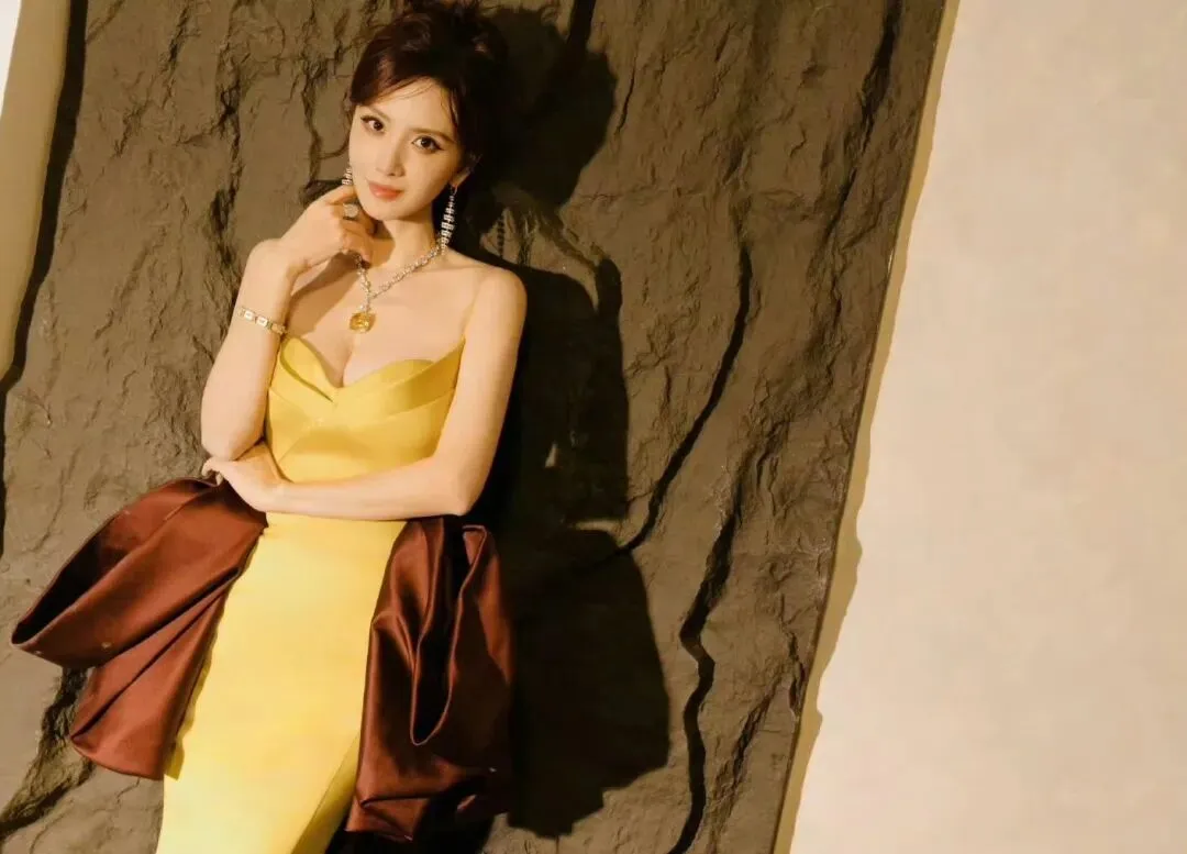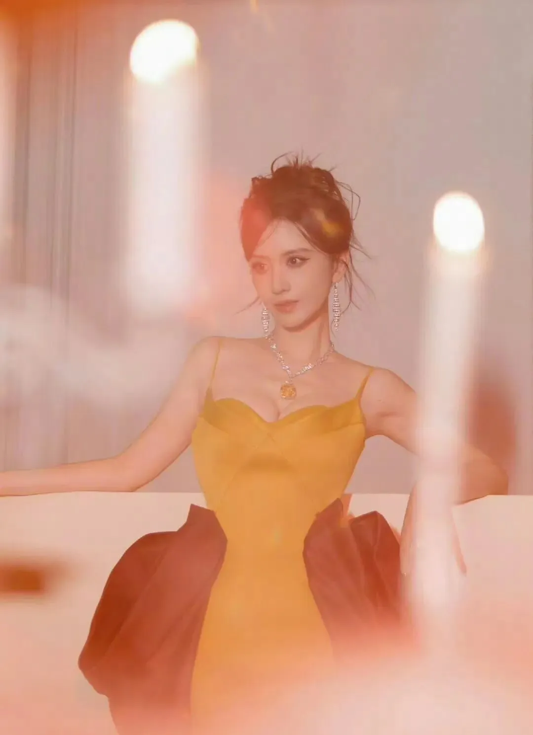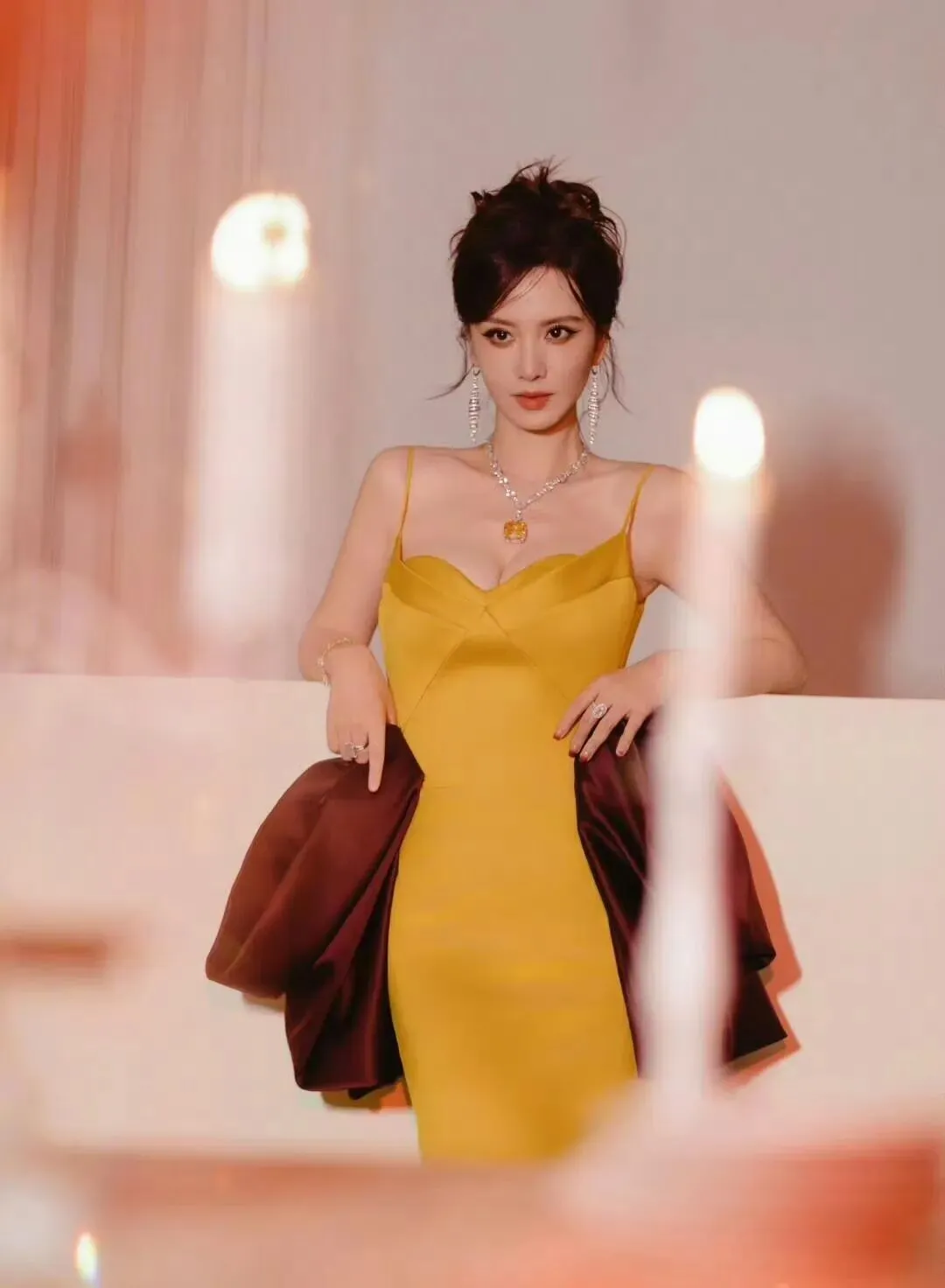 明黄色缎面礼服是整套造型的核心,高饱和度的暖调自带吸睛属性,在灯光下泛着细腻的光泽,既衬得肤色愈发白皙透亮,又带着几分复古华贵的质感。抹胸加细肩带的设计大胆露出肩颈与锁骨线条,深V领型巧妙勾勒出优越的事业线,却不会显得低俗,反而将性感拿捏得恰到好处;