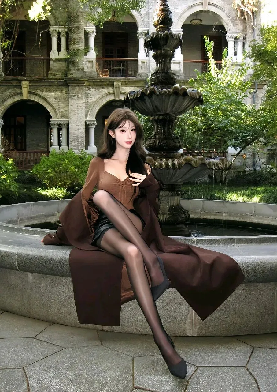黑色丝袜与尖头高跟鞋的组合则是性感的代名词。丝袜的微透效果在视觉上优化了腿部线条,而高跟鞋的设计则进一步拉长了小腿比例,让双腿在焦糖棕的衬托下显得更加笔直修长。这种"上半身温柔,下半身性感"的搭配思路,完美平衡了两种看似矛盾的风格,让穿着者既能展现女性的柔美,又能不失利落与干练。