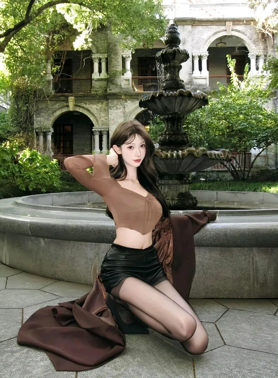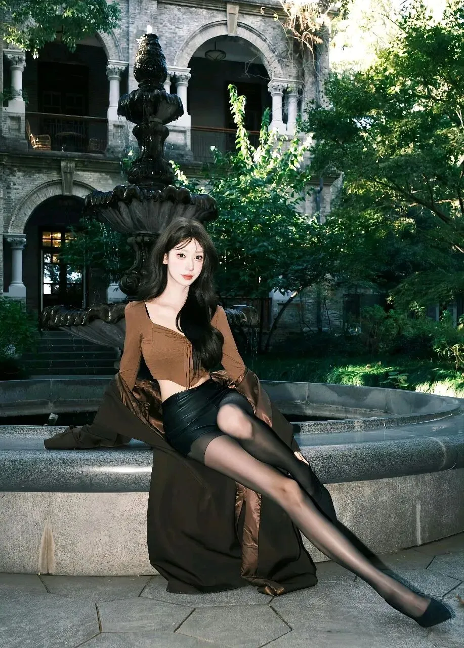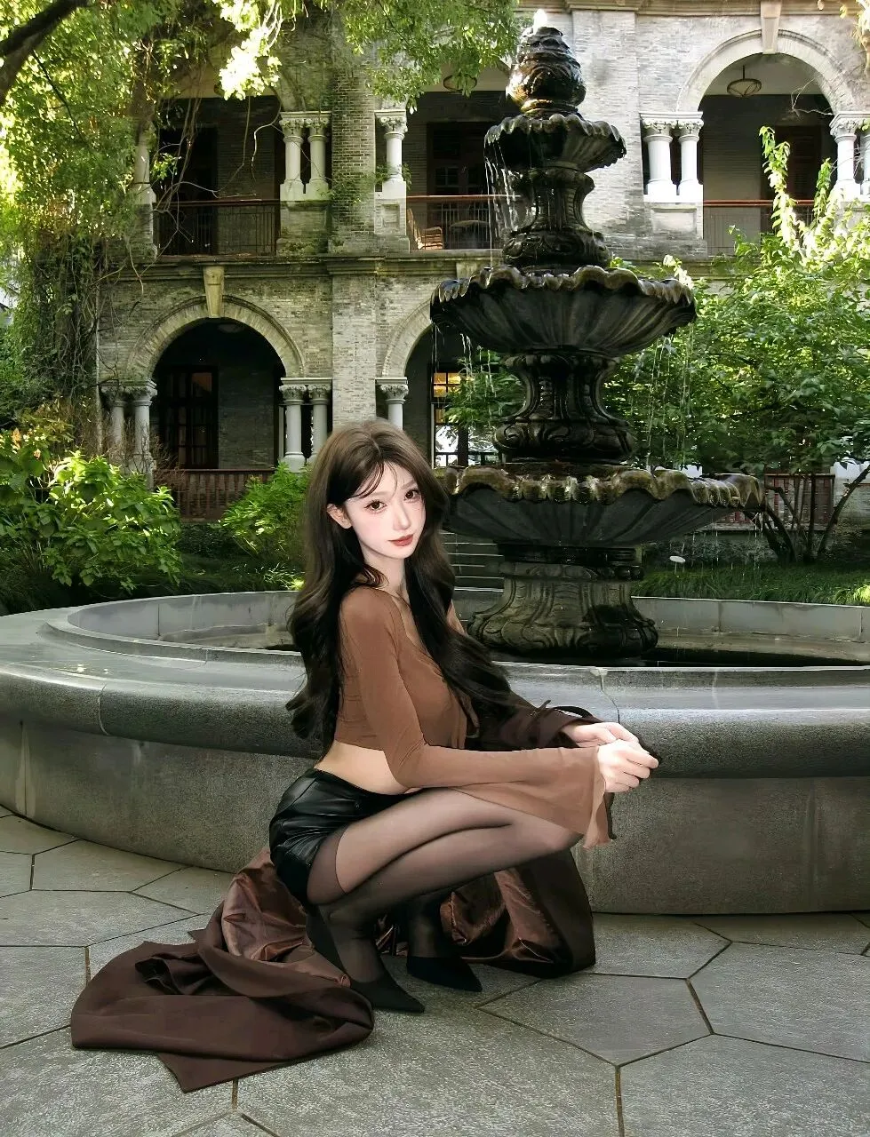 这组造型的氛围感,是秋日复古风的完美诠释。无论是坐在复古建筑的门前,让阳光透过树叶洒在身上,还是倚靠在喷泉边,感受微风拂过发丝,每一个姿态都带着毫不费力的松弛感。背景中的深褐色大门、斑驳的石墙、飘落的秋叶,共同构建了一个充满故事感的秋日场景,让穿着者仿佛从老电影中走出的女主角,每一个眼神、每一个动作都充满了戏。