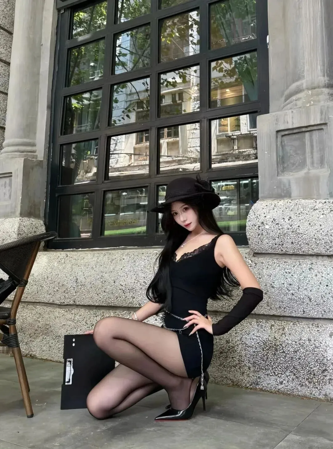 复古街巷里的时尚模特:黑丝大长腿小姐姐,性感优雅满分