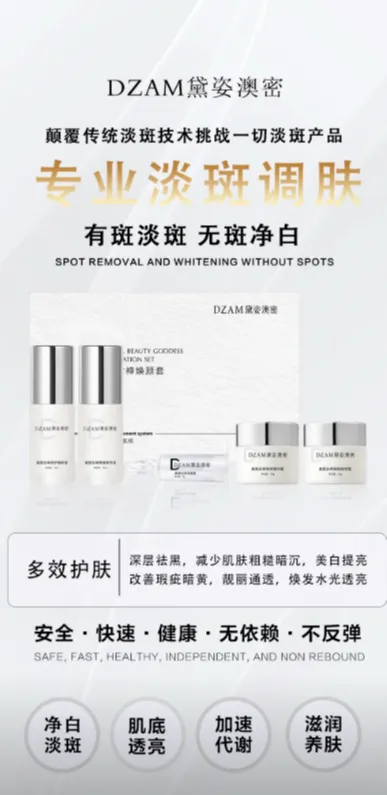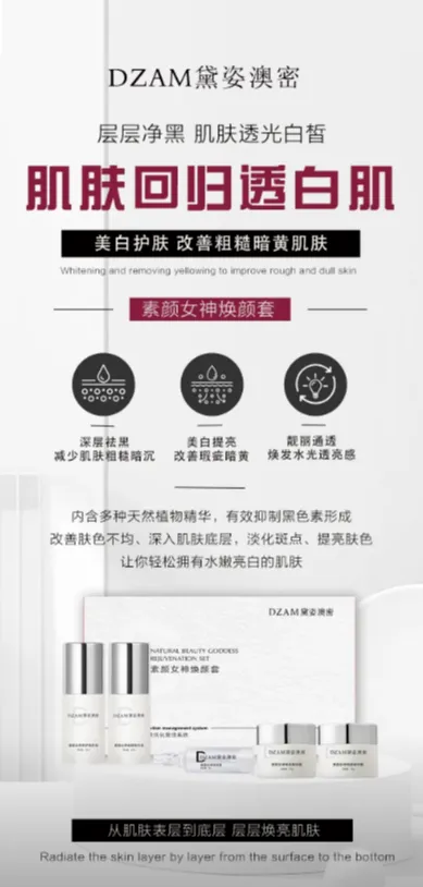黛姿澳密素颜女神焕颜套精准抓住暗沉斑肌的核心痛点,以“28天淡斑+祛黄双轨并行”为核心逻辑,打造“净黑-抑黑-焕亮-修护”的完整链路,既解决表层瑕疵,又修复肌底状态,兼顾快速见效与长期健康,真正实现“无斑净白、水光透亮”,这也是它区别于普通焕白产品的核心优势: