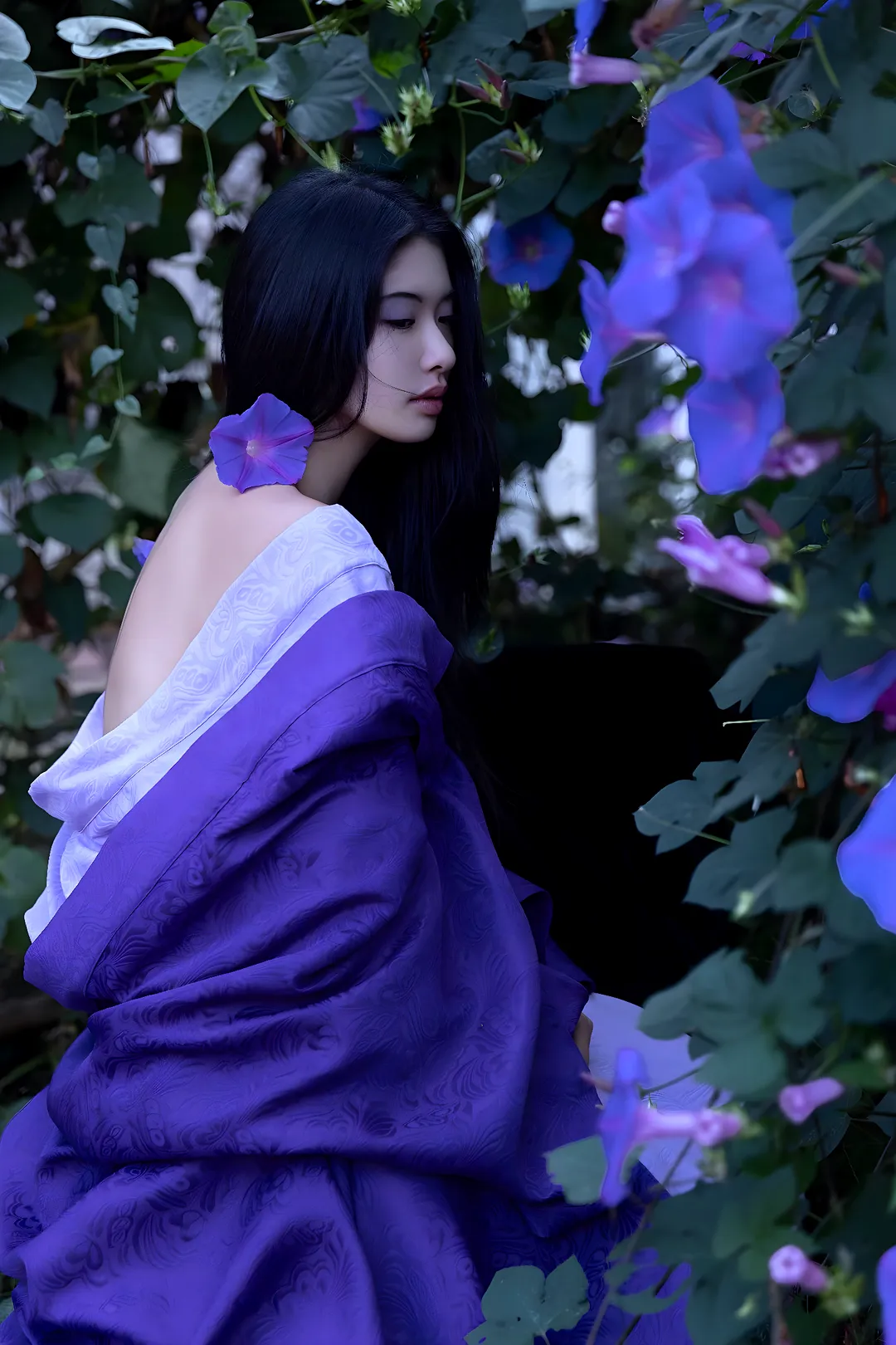 曼桢是那种一眼望去就让人想起紫茉莉开在黄昏的女子,不是灼灼逼人的艳,是浸在水色里的紫,带着点潮湿的甜。她的美像上海弄堂里藏着的一块丝绒料子,不常示人,偶尔露出来一角,便教路过的人都要放慢脚步。她懂得拿捏自己的美,像张爱玲说的,“真正的美人有遗世的清寂,也有入世的风情”,曼桢恰好兼而有之。她的头发是上好的墨色缎子,松松垂在肩颈,发梢沾着一点牵牛花的紫,那是方才在花架下坐时落上的,她也不去拂,只当是造物额外的馈赠。她的眉是远山含黛,眼尾微微上挑,却不是跋扈的风情,是带着点倦意的温柔,像刚从一场西洋梦里醒过来,睫毛上还沾着梦里的月光。她的嘴唇是薄而润的,颜色是淡粉里揉了点豆沙,说话时总带着点笑意,不是为了讨好谁,只是习惯了用温柔做铠甲。她知道自己好看,却从不用这份好看去换取什么,这是她的矜贵。就像橱窗里的高级成衣,标价明明白白,懂的人自然会为那剪裁与面料买单,不懂的人,她连多看一眼都觉得是浪费。有次在咖啡馆,邻座的男人偷瞄她,被她撞破了眼神,她也不恼,只轻轻端起咖啡杯,用杯沿挡住半张脸,嘴角弯出一个狡黠的弧度,那笑意里有 “我知道你在看我” 的了然,也有 “但我并不在意” 的疏淡。这种带着点疏离的幽默,比直接的嗔怪更叫人着迷。她的美从来不是静态的,是流动的,像风穿过紫藤花架,带着细碎的香。她低头拨弄花瓣时,脖颈的线条像天鹅般优雅;她侧耳听人说话时,睫毛在眼下投出一小片阴影,像水墨画里的留白;她偶尔蹙眉,那一点愁绪也像江南的烟雨,朦胧得叫人心疼。她懂得在不同的时刻展现不同的美,却又始终保持着自己的内核,像一颗被打磨得圆润的珍珠,无论在何种光线下,都能透出温润的光泽。她的美里有智慧,不是书呆子的迂腐,是懂得人情世故后的通透。她知道什么时候该收敛锋芒,什么时候该释放魅力,像高明的棋手,每一步都走得从容不迫。