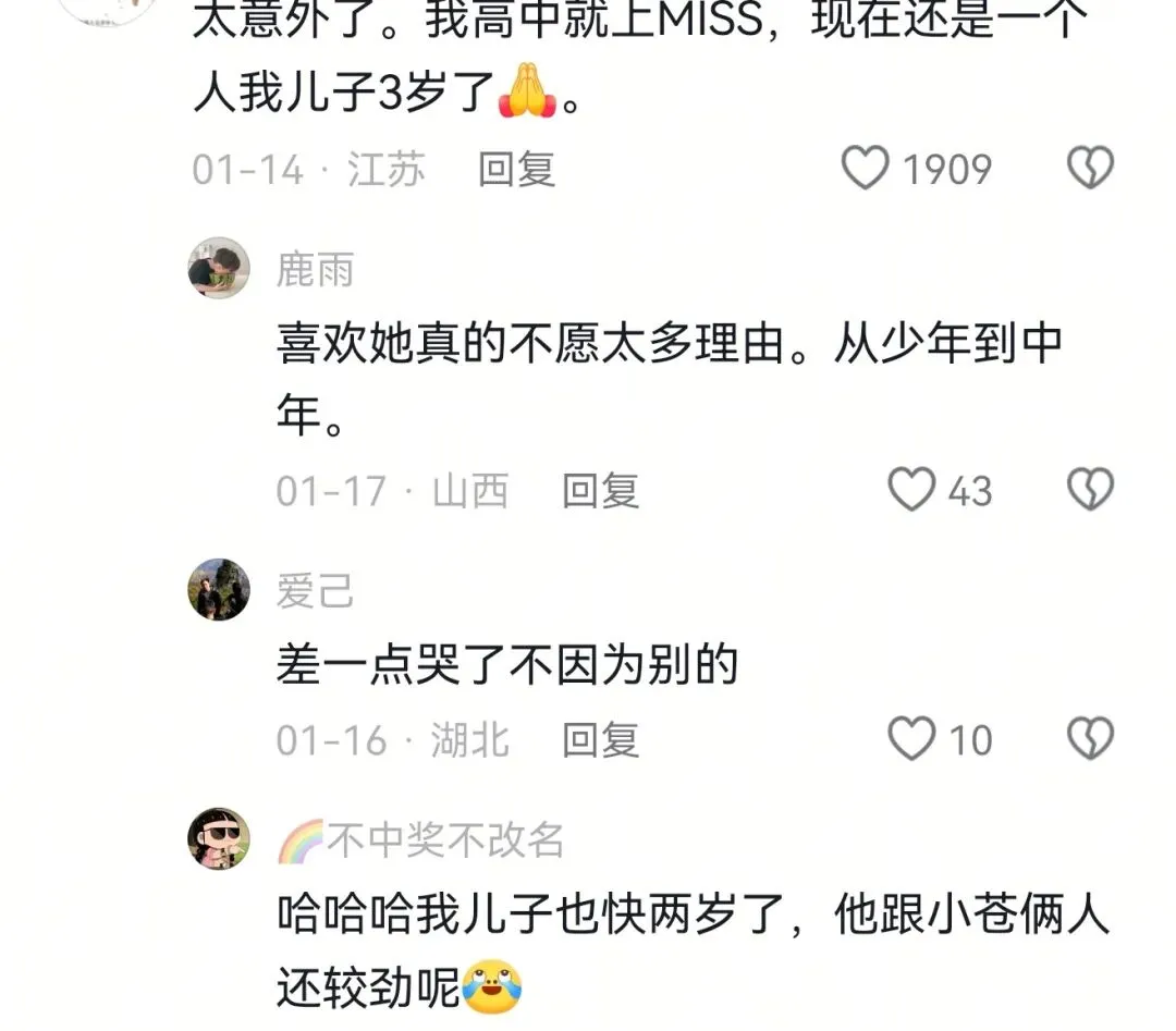 但是知道不是Miss的孩子以后,真爱粉还有点失望,都表示,Miss基因这么好,也这么久了,真的可以有一个孩子了,祝福Miss早日找到真爱吧。正如真爱粉所说,喜欢Miss不需要理由,青春万岁。