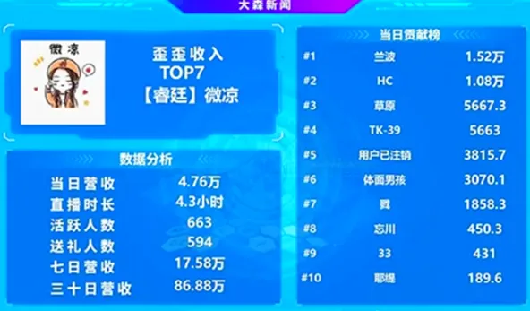 这一场直播下来,微凉收获颇丰,直接收到了4.76万。这个数字可不简单,在全YY各大主播收入排行榜上,微凉一下子就冲到了第7名。要知道,之前因为兰波哥不在,微凉在这榜单上可没这么亮眼的位置。