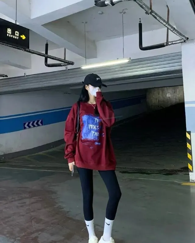 一件复古红的卫衣 , 配黑色legging , 简单吧?但你试试加一双红色短袜跟卫衣呼应 , 再踩双小白鞋 , 内搭白色打底跟鞋子也呼应上了 , 整个人立马不一样。 就这么点细节 , 效果差很多。