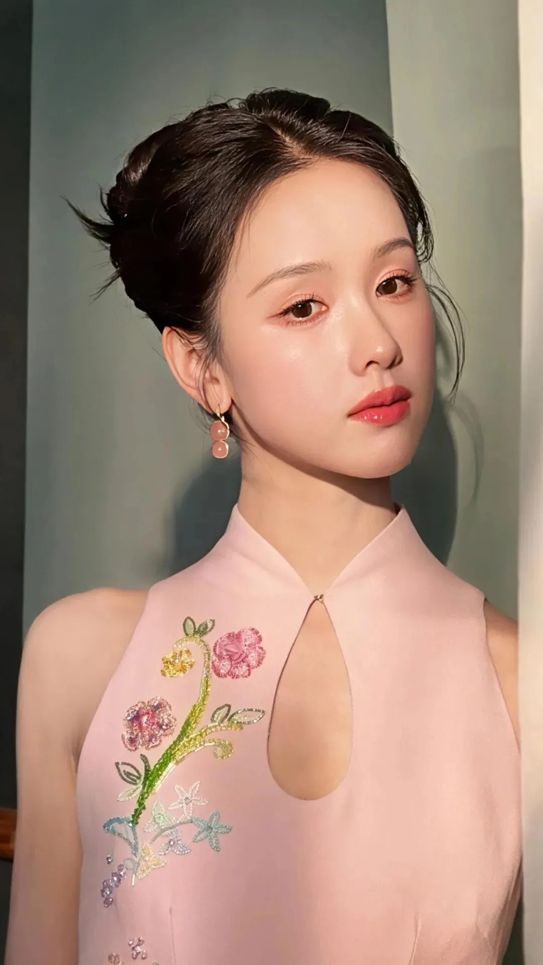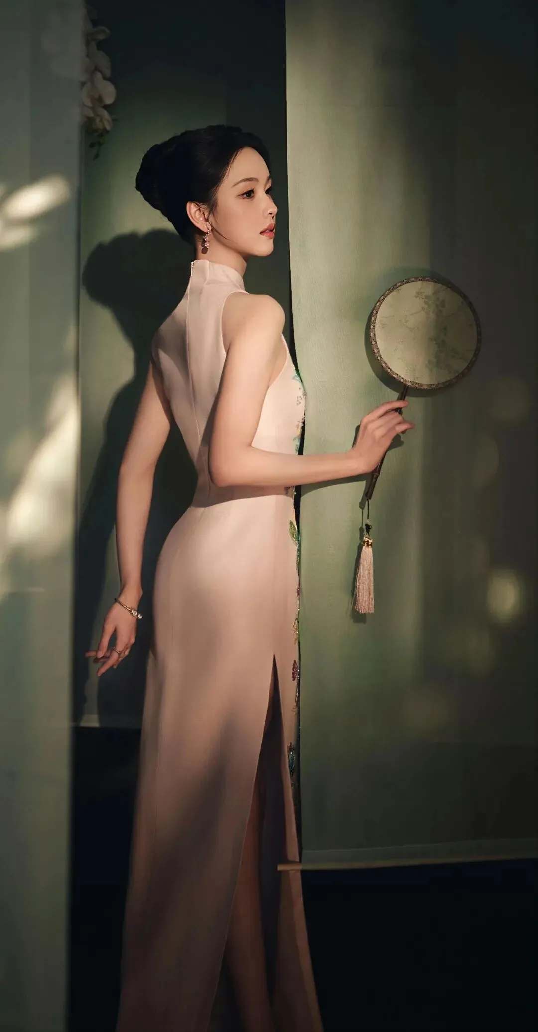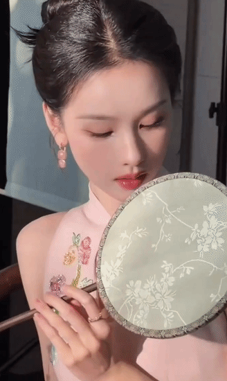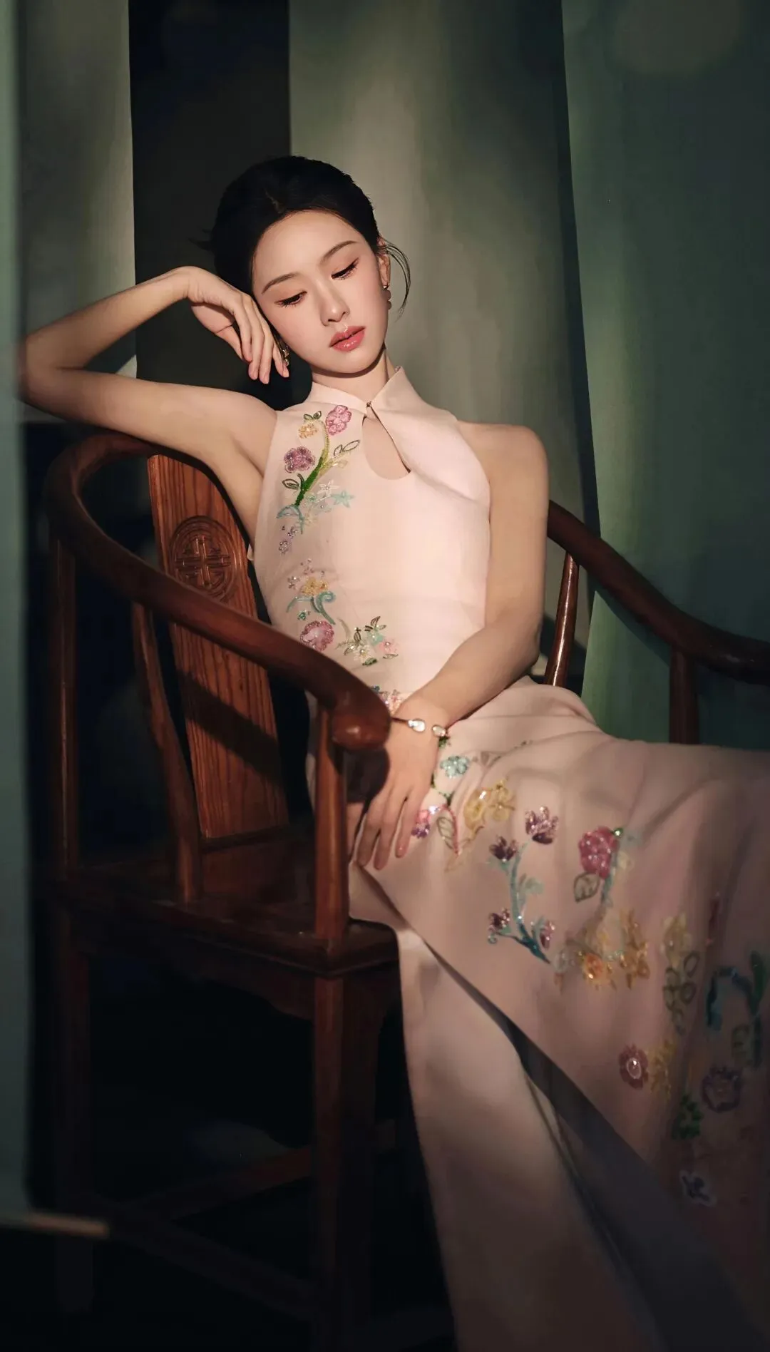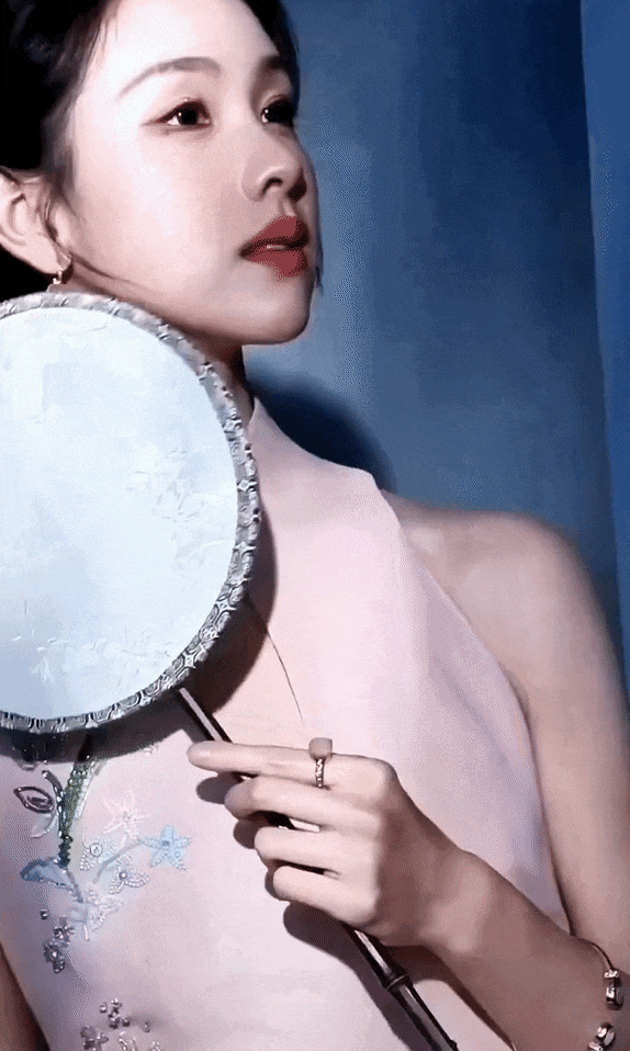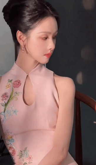 粉色旗袍本身承载着浓郁的古典意象,而紧身剪裁与淡雅配色,却滤去了厚重的年代感,赋予其轻盈的现代气息。