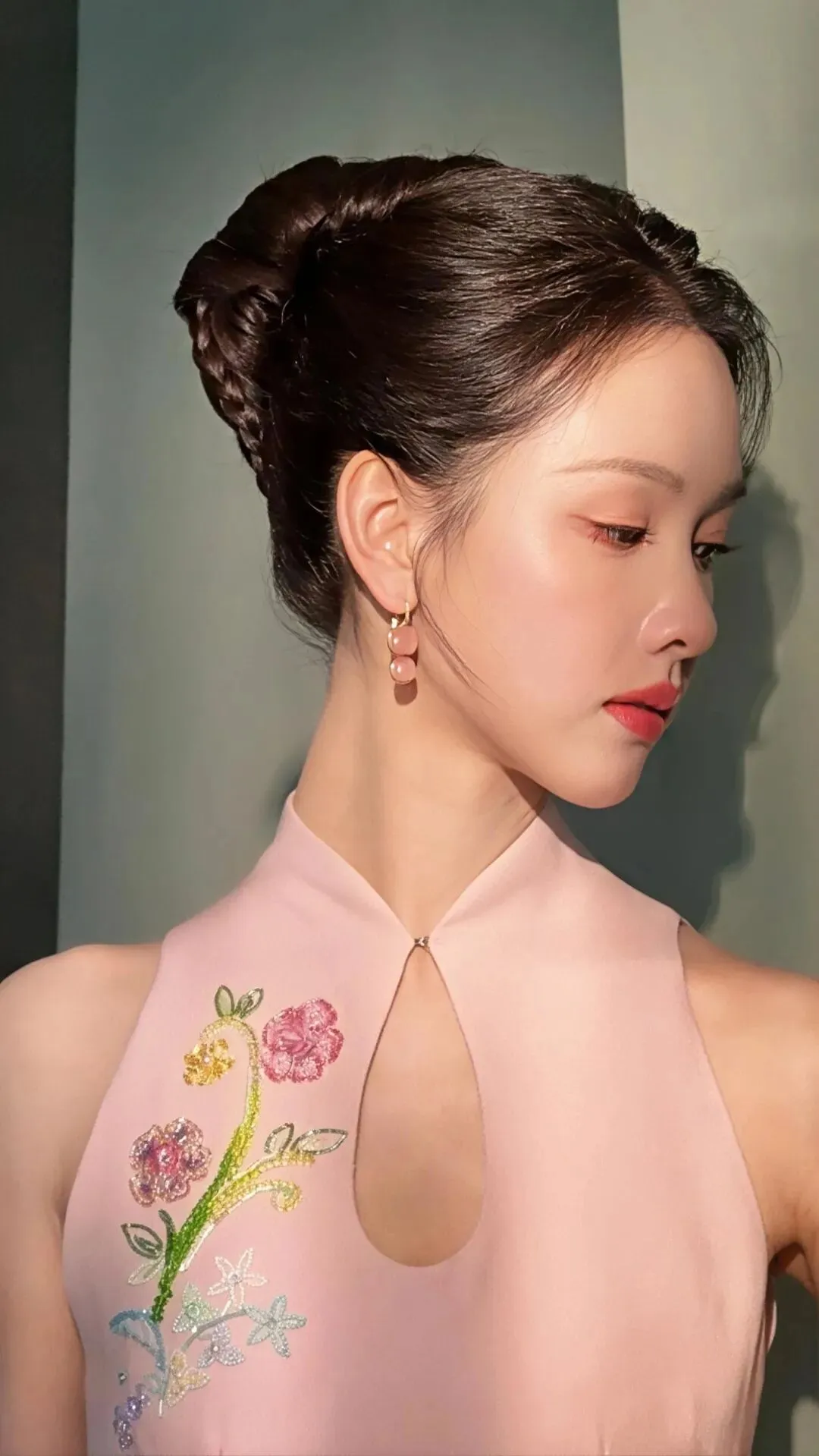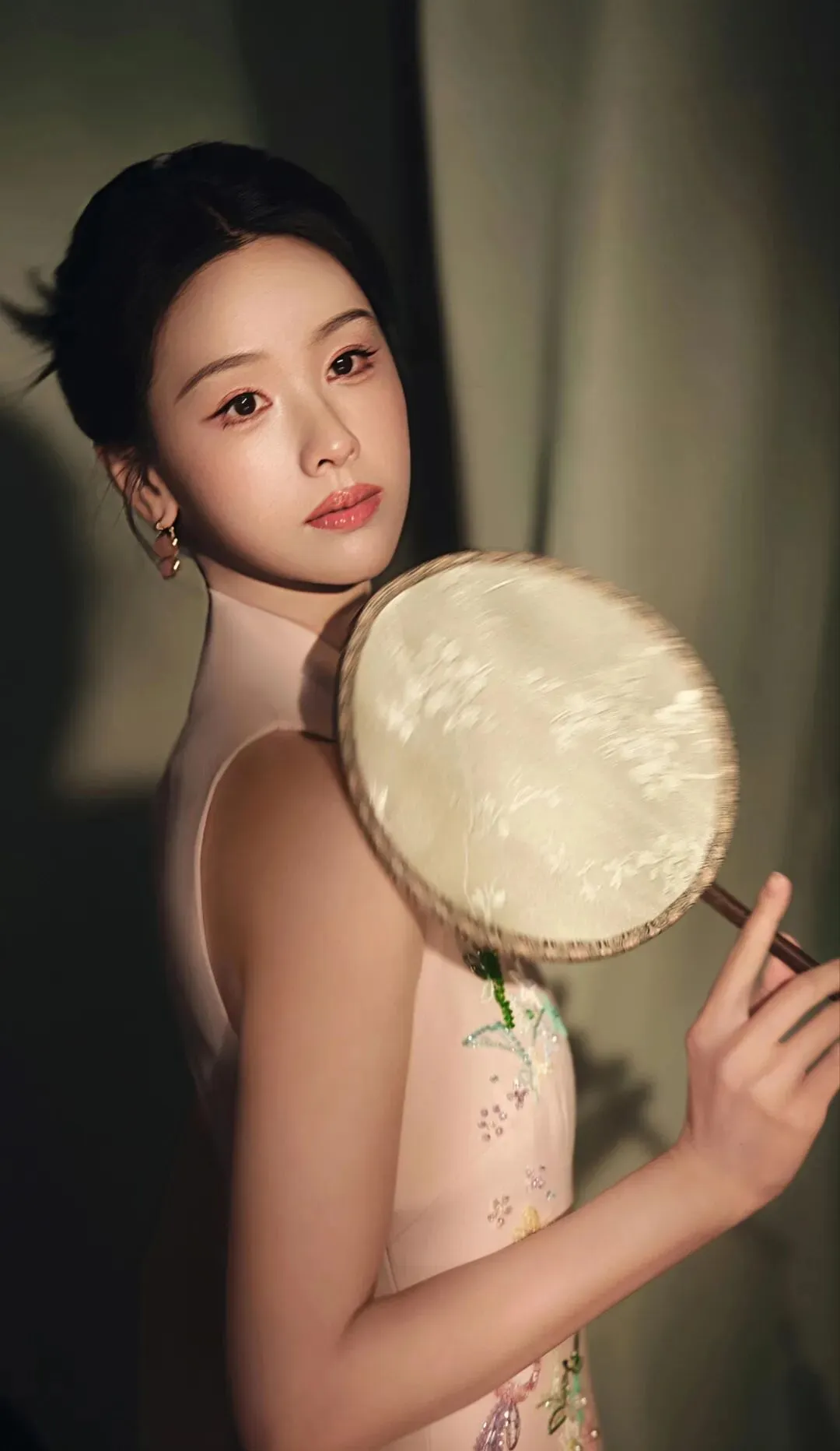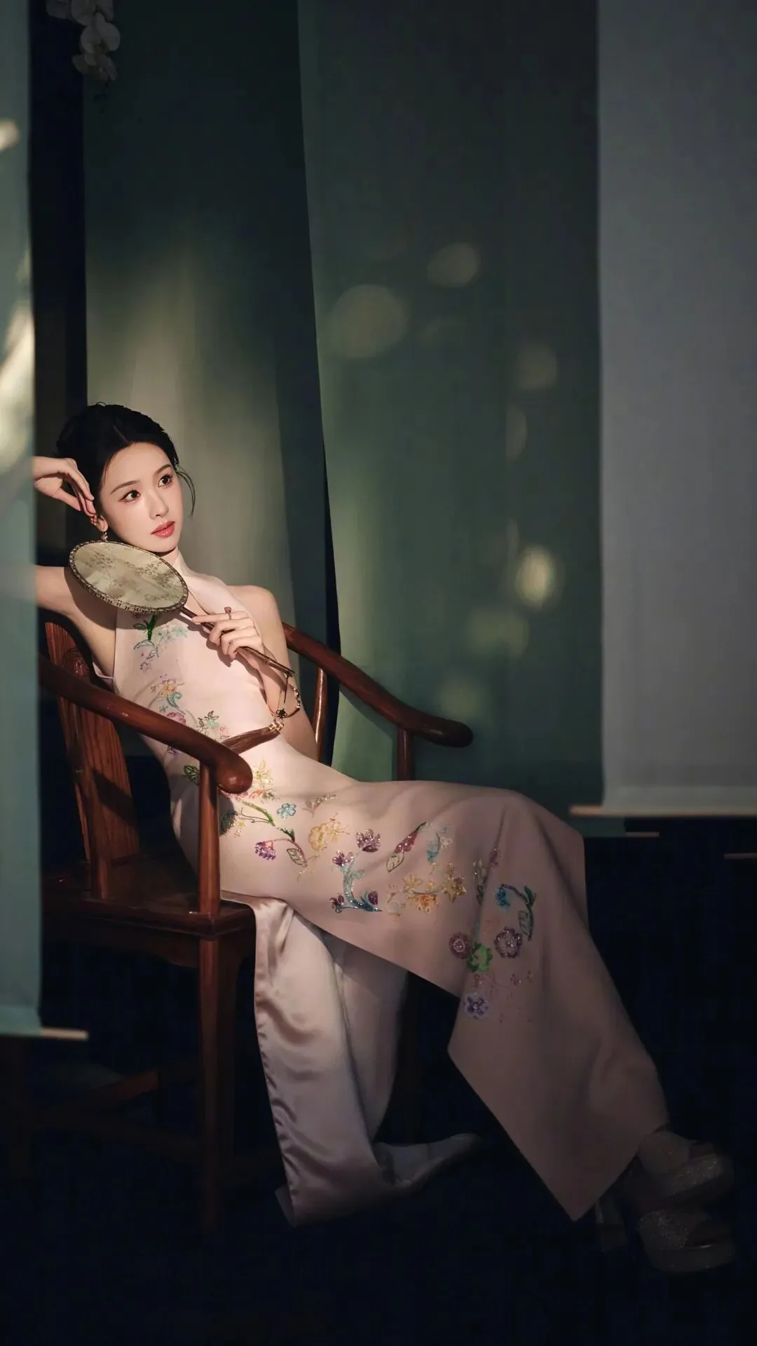 粉色旗袍本身承载着浓郁的古典意象,而紧身剪裁与淡雅配色,却滤去了厚重的年代感,赋予其轻盈的现代气息。