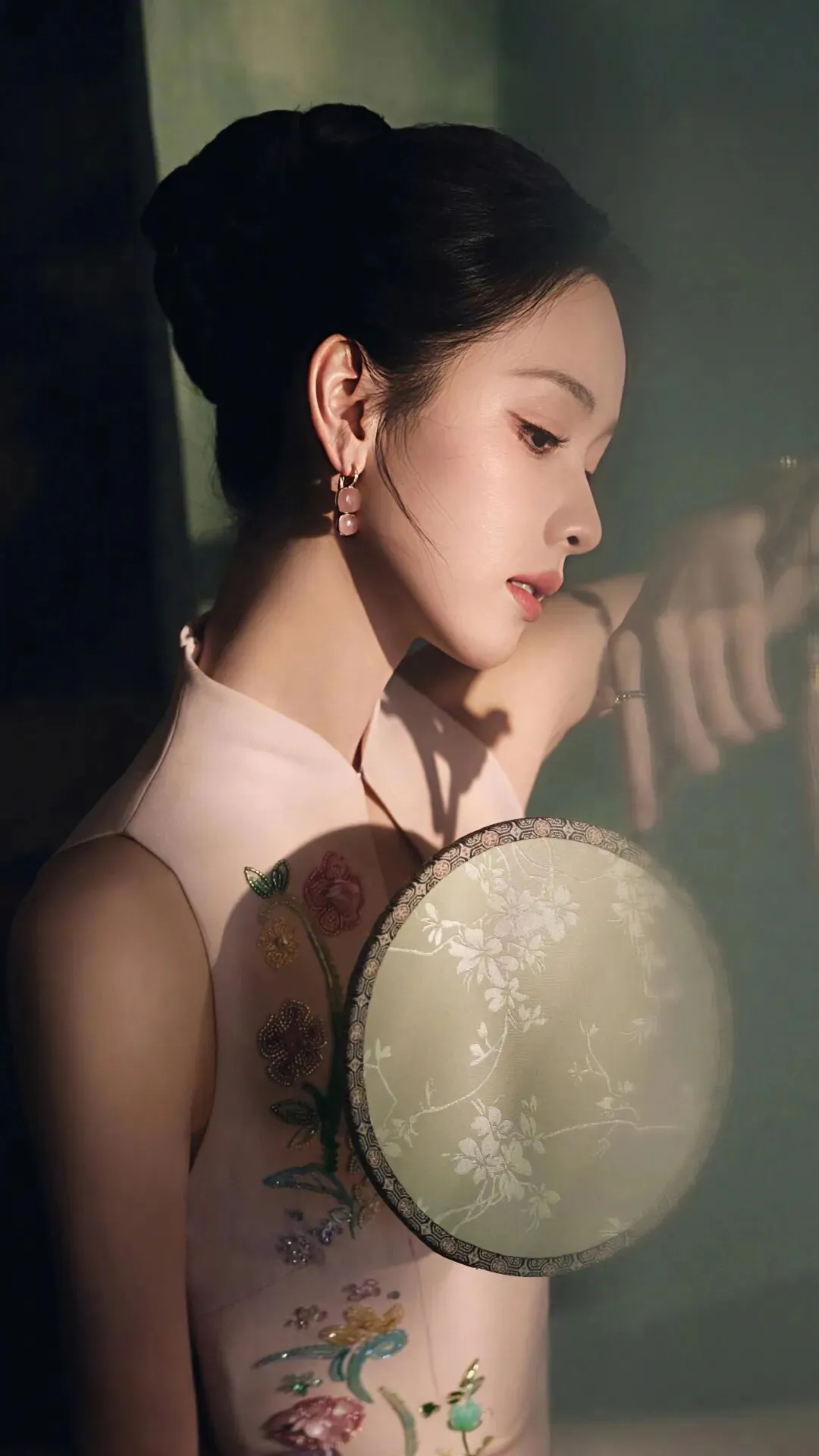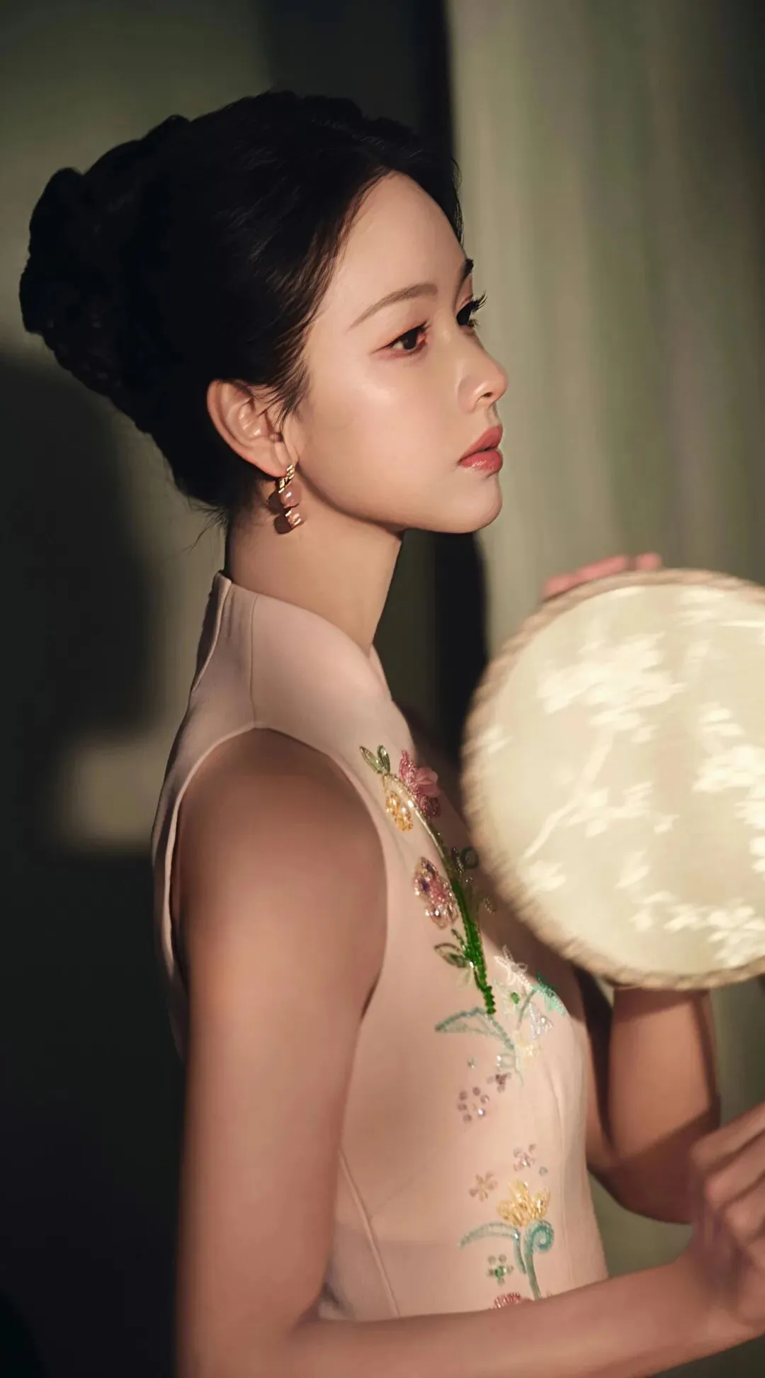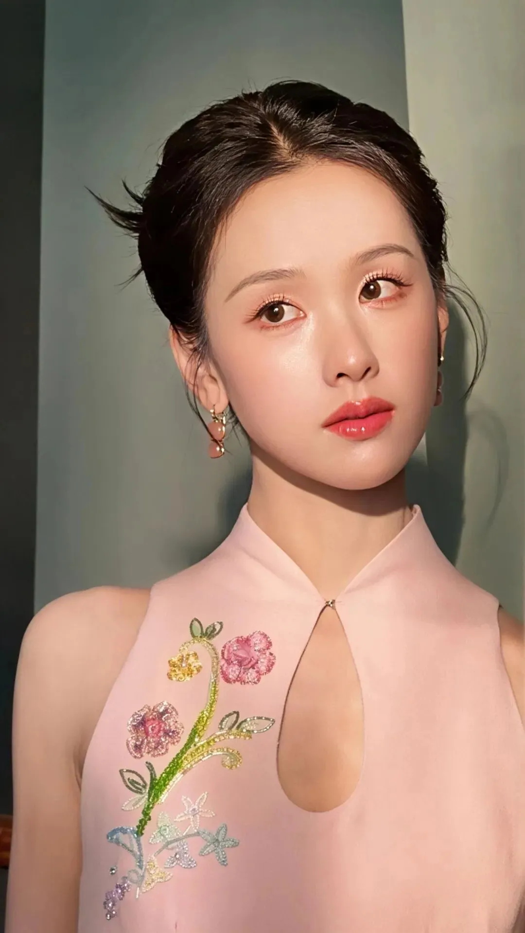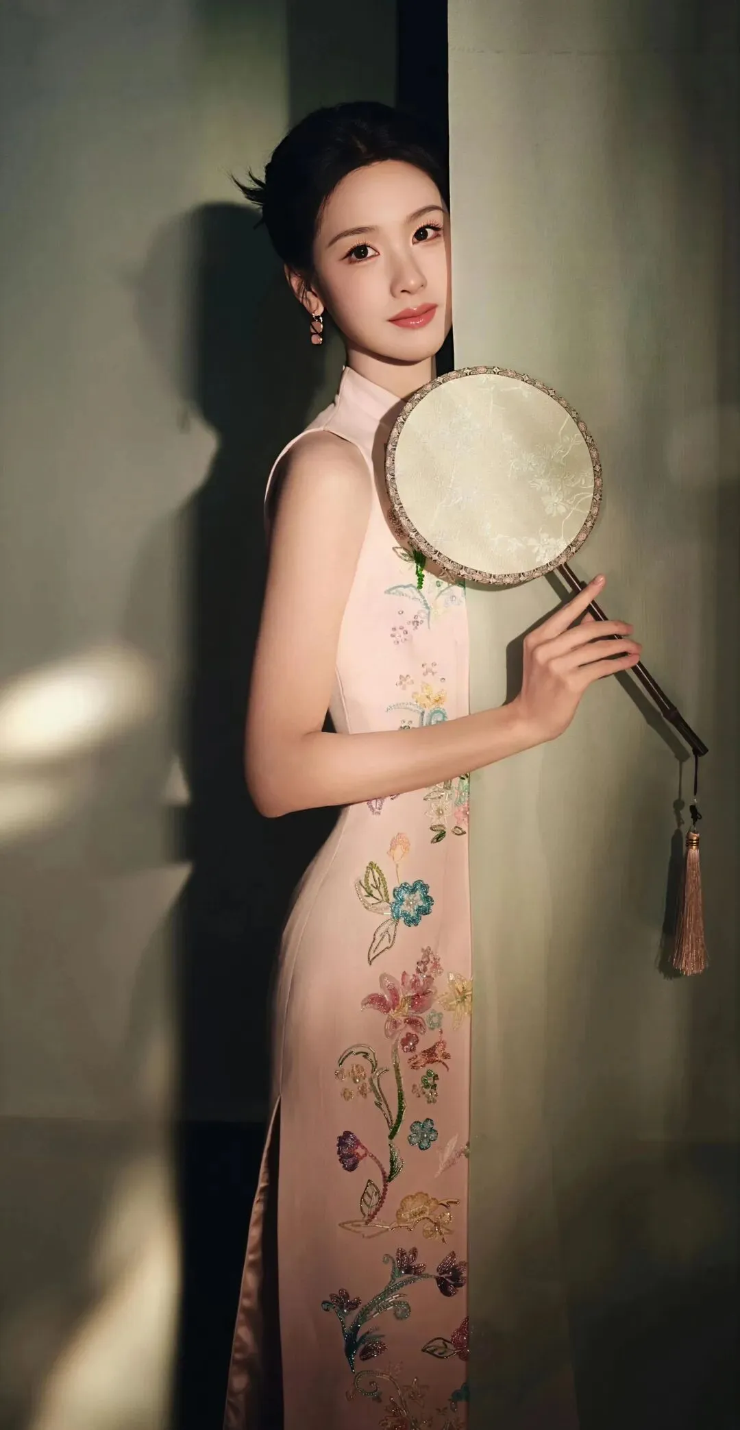 粉色旗袍本身承载着浓郁的古典意象,而紧身剪裁与淡雅配色,却滤去了厚重的年代感,赋予其轻盈的现代气息。