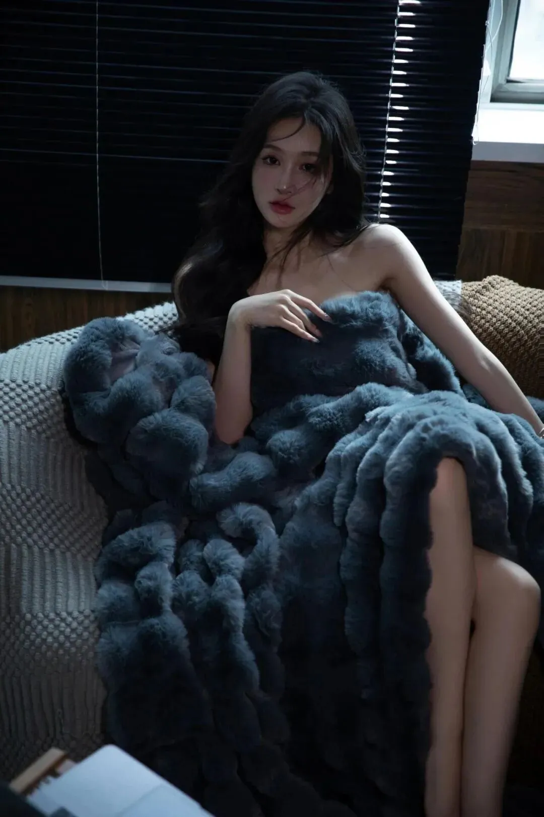 用厚实的毛绒毯裹住肩膀和半边身体,身体向后轻靠在沙发靠背,头微微歪向一侧,垂着眼睛像在走神想事情。光线从侧面的缝隙里漏进来,落在毯子的绒面上泛着柔光,安静的样子自带故事感,怎么拍都好看。