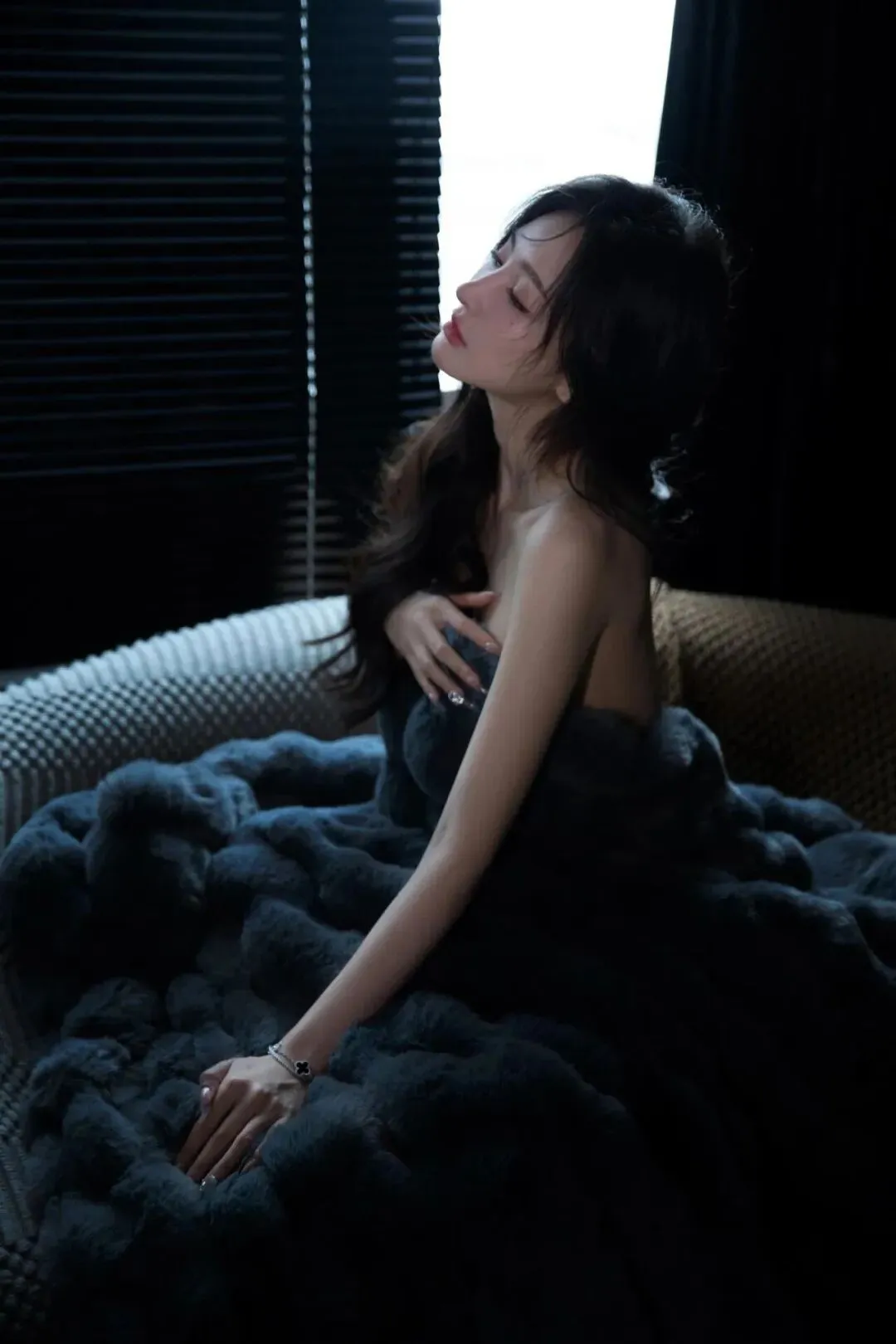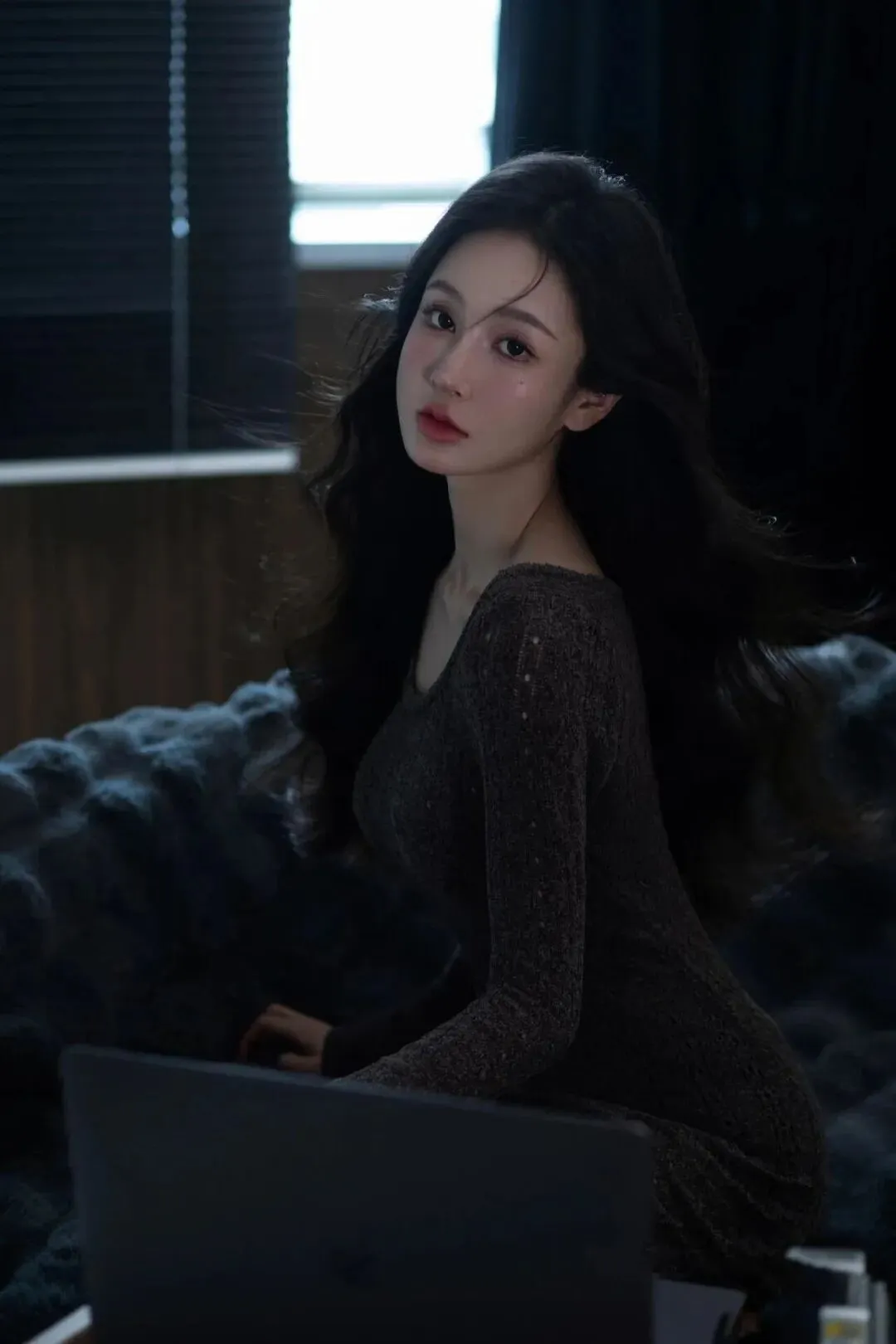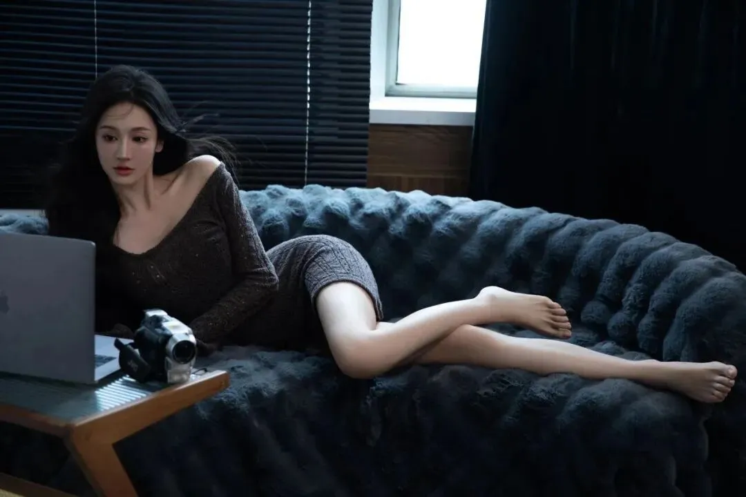 最近在暗调的居家场景拍了一组写真,软乎乎的毛绒沙发、半拉的百叶窗,还有一台打开的笔记本,都成了最好的道具。没让模特硬凹姿势,只是让她放松下来,像平时宅家一样发呆、摸电脑、裹着毯子晒太阳,镜头里的画面就自然又有温度。