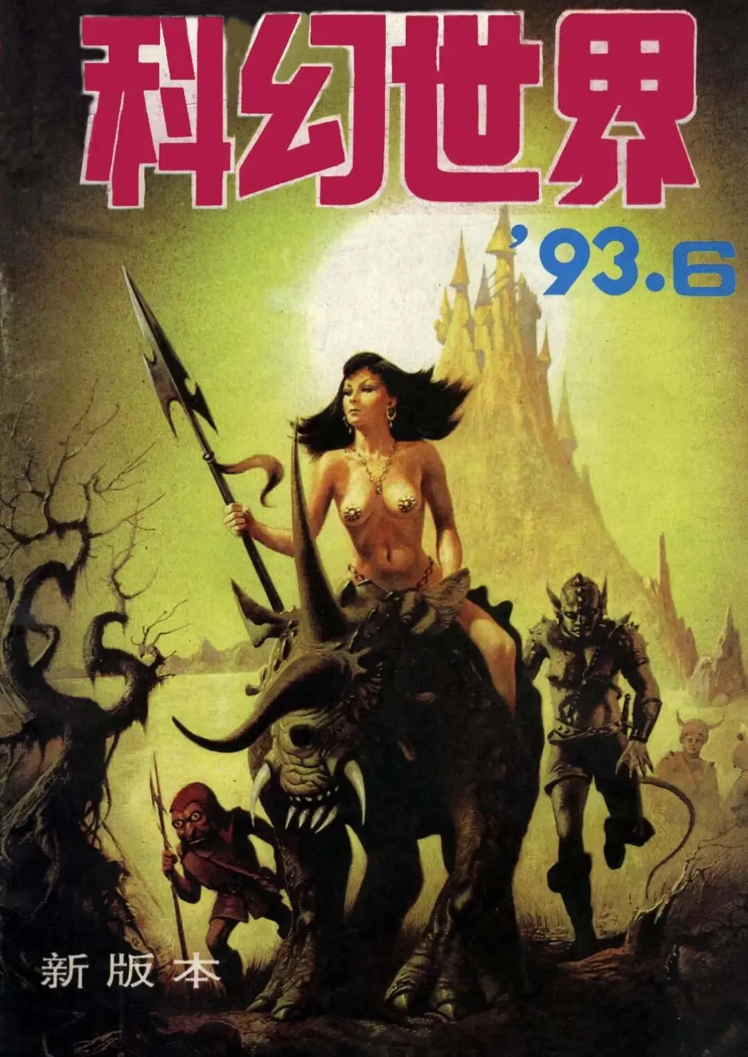 在1993-1996年《科幻世界》封面中,女性形象的造型主题在传说英雄、神仙灵怪、现代女性之间反复更迭,可被统称为“狂想化的神妖人怪”。例如,1993年6月刊封面描绘了一位带着兽人随从朝观者走来的部落女首领,她身骑异兽、手执长枪,却几乎没有衣物蔽体。1995年3月刊封面中的女性是位双手叉腰、侧身望向左前方的女航天员。1996年9月刊封面中的女性则是位高举紫色绸缎的白纱女神,似乎正在施展呼风唤浪的法术。此四年间女性形象造型主题历经再三变化,与彼时《科幻世界》办刊前景尚不明朗、编辑团队追求创新等客观因素息息相关,侧面反映出中国科幻在上世纪八九十年代之交刚刚走出“科文之争”阴影、尚未完全恢复元气的历史事实。