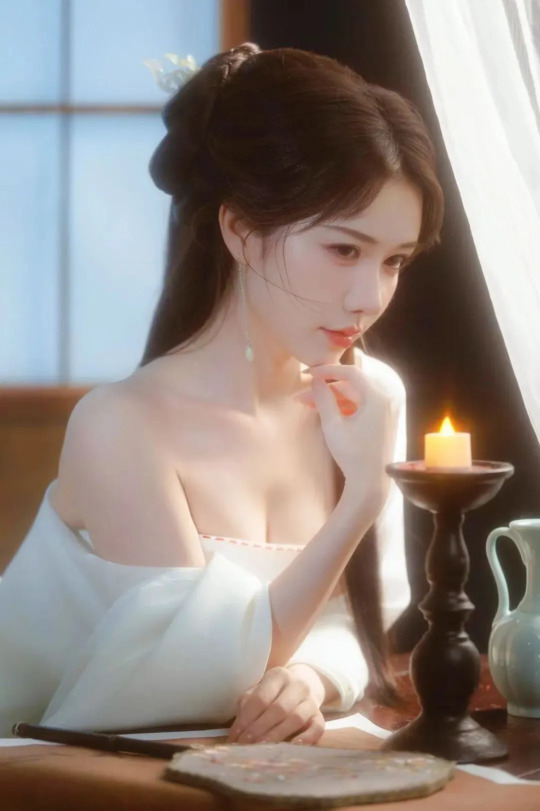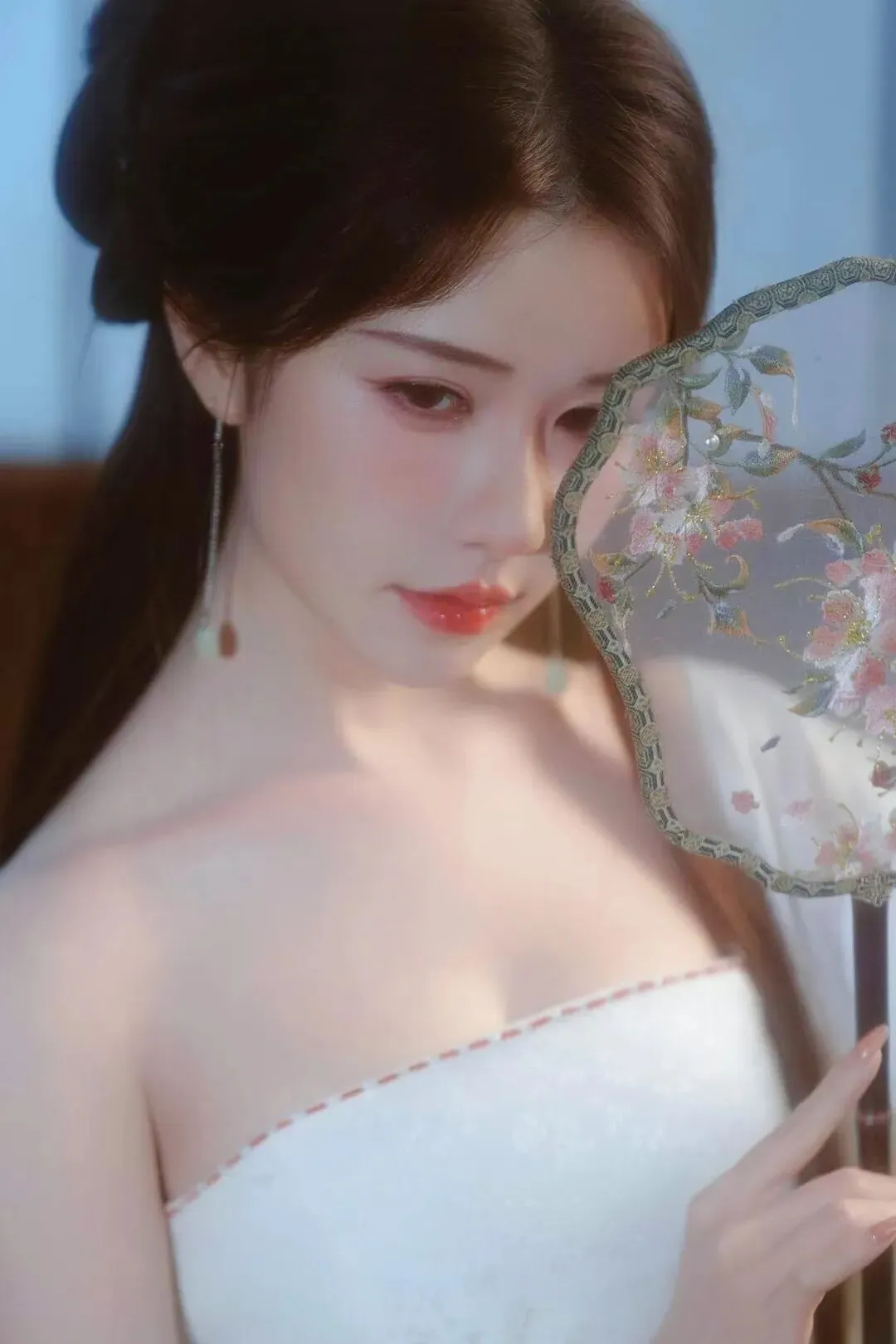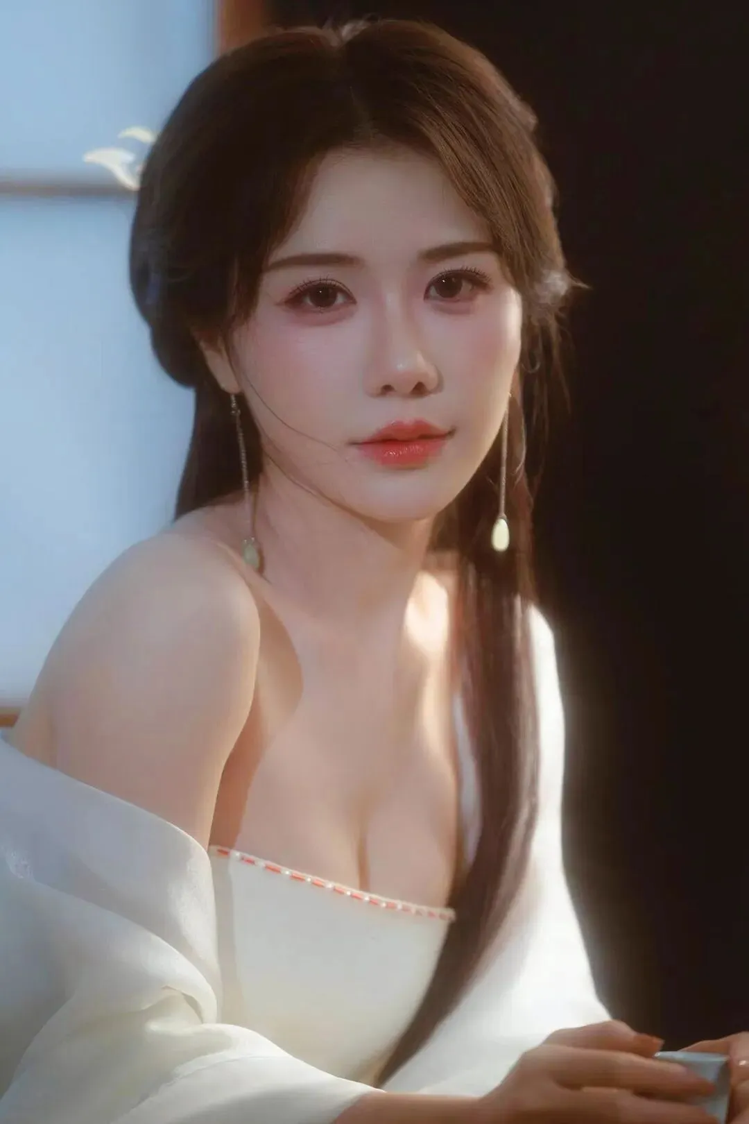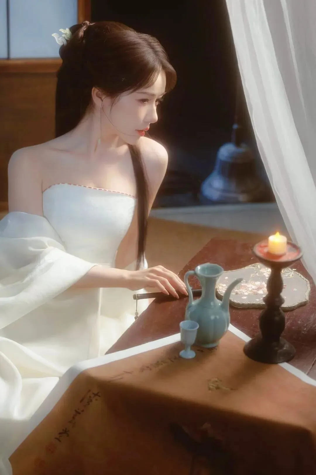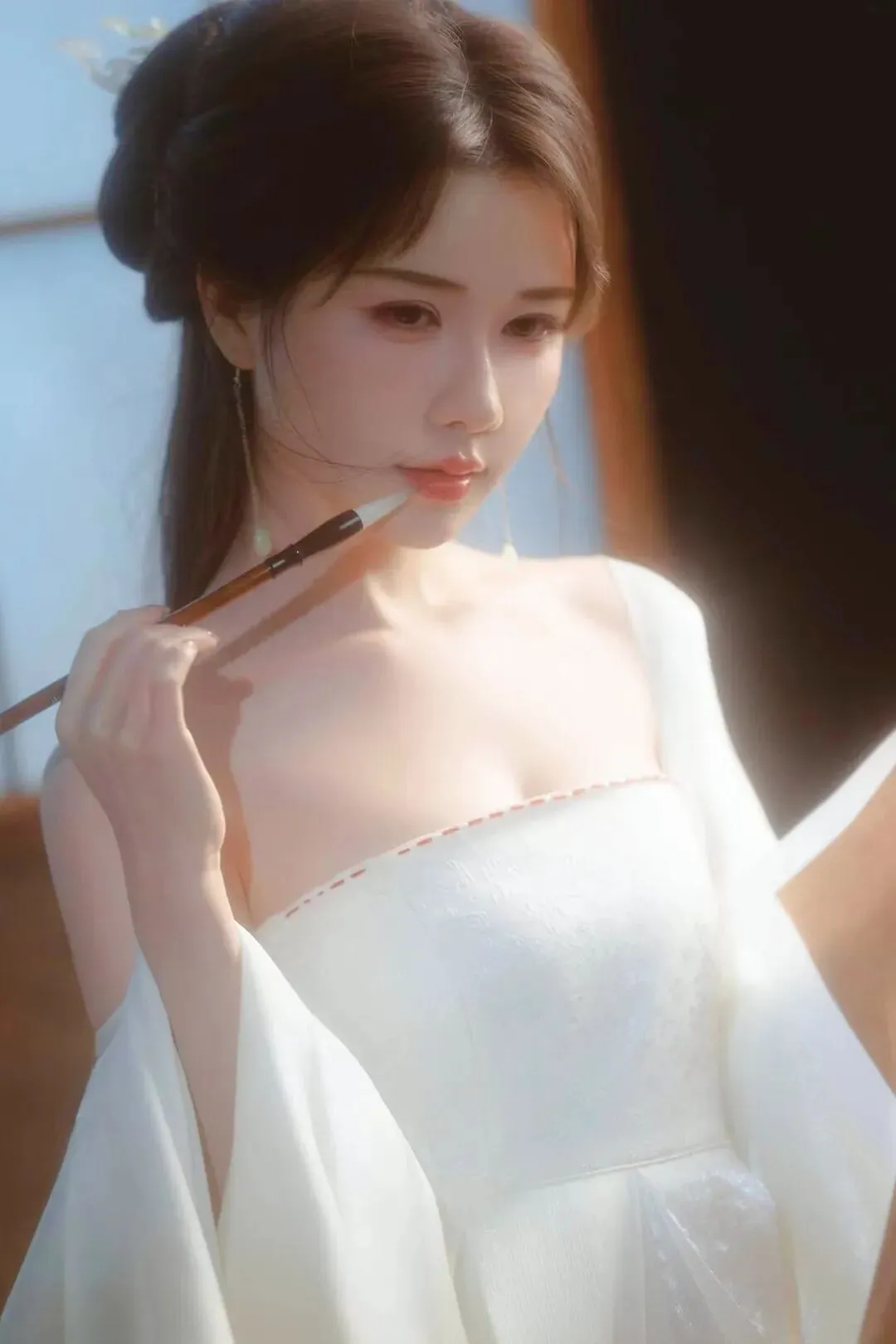 📷一袭素白抹胸裙,如月光裁成的流云。松挽的发间簪着细蕊银花,耳坠随呼吸轻晃。手捧青瓷酒壶,在漏窗的光影里,把清冷的氛围感穿成了诗。