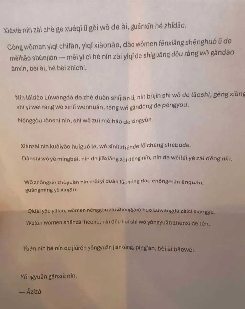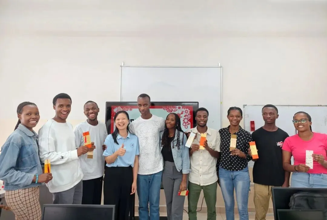 初抵穆桑泽学院,倪柳便肩负起电商、电气自动化专业大一、大二学生《通用汉语》与《专业汉语》的教学任务。为让中文教学更贴合海外学情,她赴卢旺达大学孔子学院交流取经,吸纳成熟的国际中文教育推广经验,结合不同年级学生的认知特点开展汉语角活动:组织剪纸、书写汉语祝福贺卡、学说汉语吉祥话、学唱经典中文歌曲等趣味互动,让汉语跳出课本局限,化作连接中非文化的鲜活纽带。当中国驻卢旺达大使走进汉语课堂时,学生们捧着亲手书写的汉语祝福贺卡上前赠送,字里行间满是真诚与热情,成为课堂上最温暖的瞬间。学期末,电商专业大二学生Haziza特意用拼音写下了一封感谢信,字里行间的喜爱与认可,成为她异国教学路上最珍贵的慰藉。