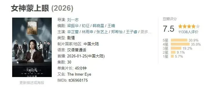 《女神蒙上眼》以豆瓣7.5开画,是近年来国产律政题材罕见的豆瓣高分剧。播出期间,收视与热度上更是屡创佳绩:截至2月5日15点,猫眼热度峰值破9700,拿下剧集热度周榜冠军、日榜多连冠;CVB数据打破湖南卫视211天黄金档收视率纪录;酷云、欢网等多平台收视率同样实现11连冠。