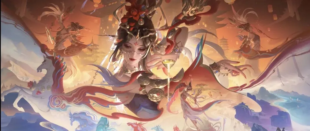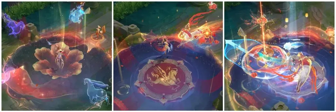 我们来看下貂蝉马限的特效设计,整体制作是围绕丝路、长安的文化元素;比如翼马纹、石榴花、团花纹等多种纹样,共同汇造视觉表现,以此也表达了长安的繁华。