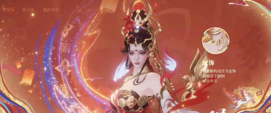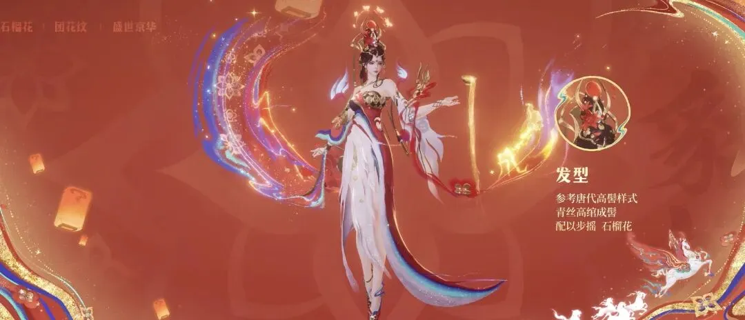 皮肤的整体配色是火红、白辅以金三色为主,我们在服饰中能看到团花纹、翼马纹装饰,这也是长安丝绸之路的主要特色元素