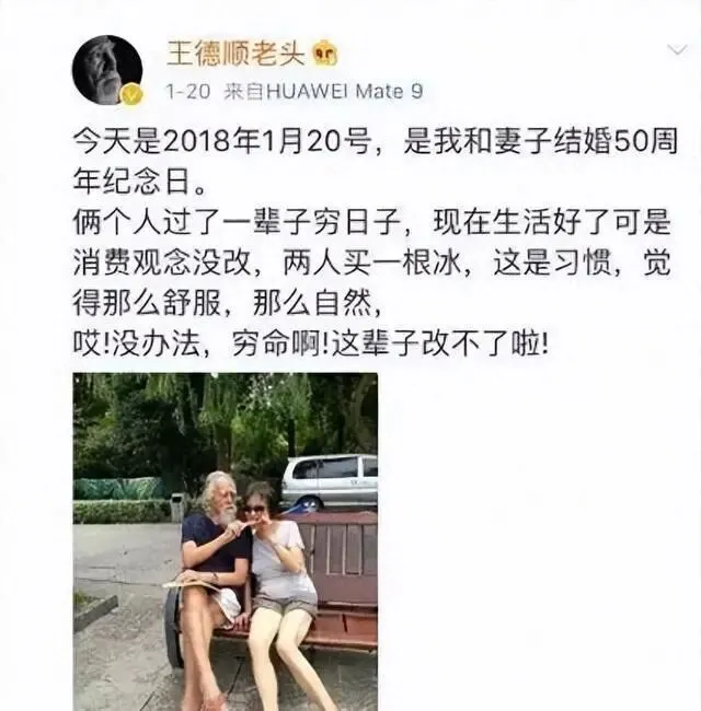 2018年,王德顺在微博发布了自己和爱妻的合影。