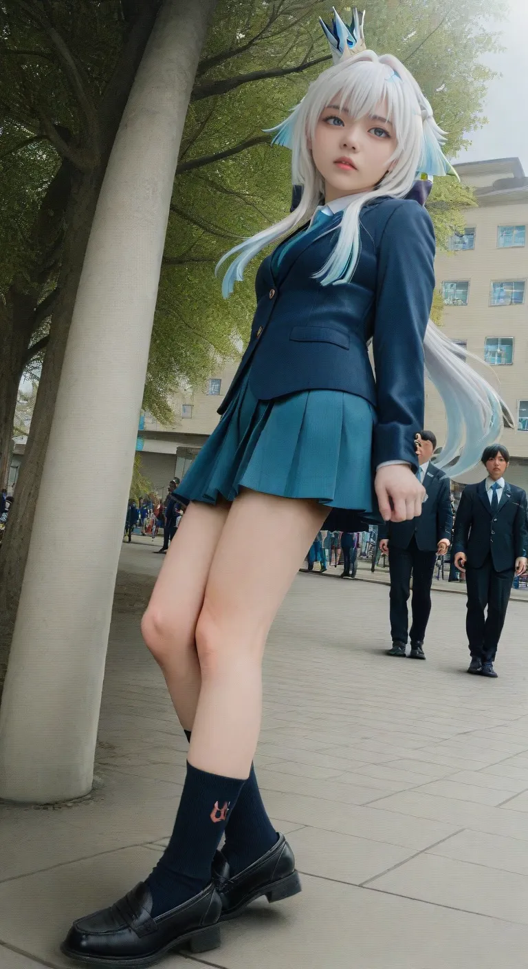 早上,我带她回到了我的母校。刻律德菈换上了一身藏青色的高中校服,尽管她的身材娇小,在穿上这身代表着青春与规训的制服后,却依然散发着一种要把整个校园都纳入版图的气场。她站在空荡荡的操场看台上,风吹乱了她银白发梢的青色挑染,她单手叉腰,指尖轻轻拨弄着领带,眼神中带着对这种和平生活的某种好奇与不屑。