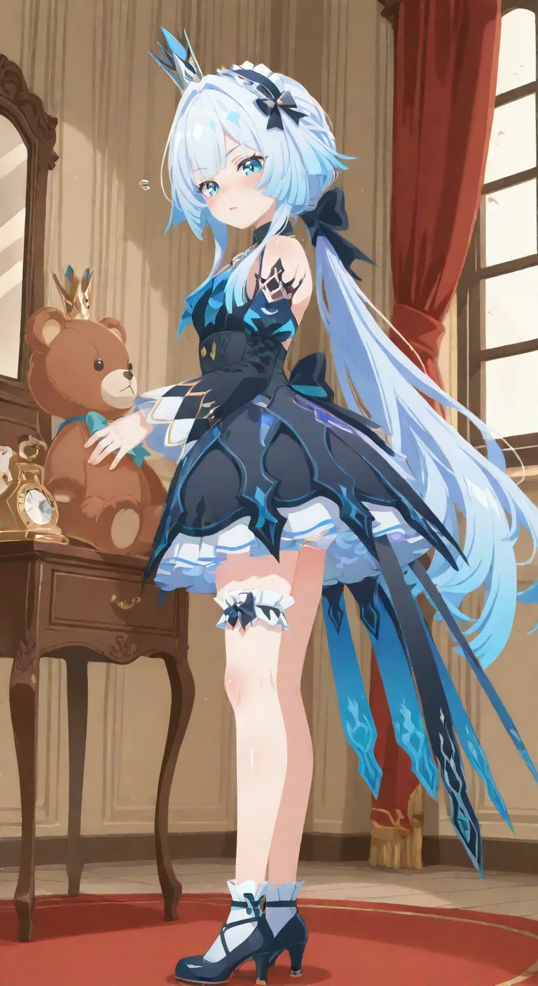 “这身装束……倒是让我想起了那个诅咒——‘以永恒的幼年换取王冠’。在那些漫长的岁月里,我也像这只小熊一样,被摆在王座上供人膜拜,却无法触碰任何真实的温度。但现在不同了,因为是你把我从那个冰冷的橱窗里‘买’走的。我是你的收藏品吗?不,我是自愿走进这笼子的猛兽。”