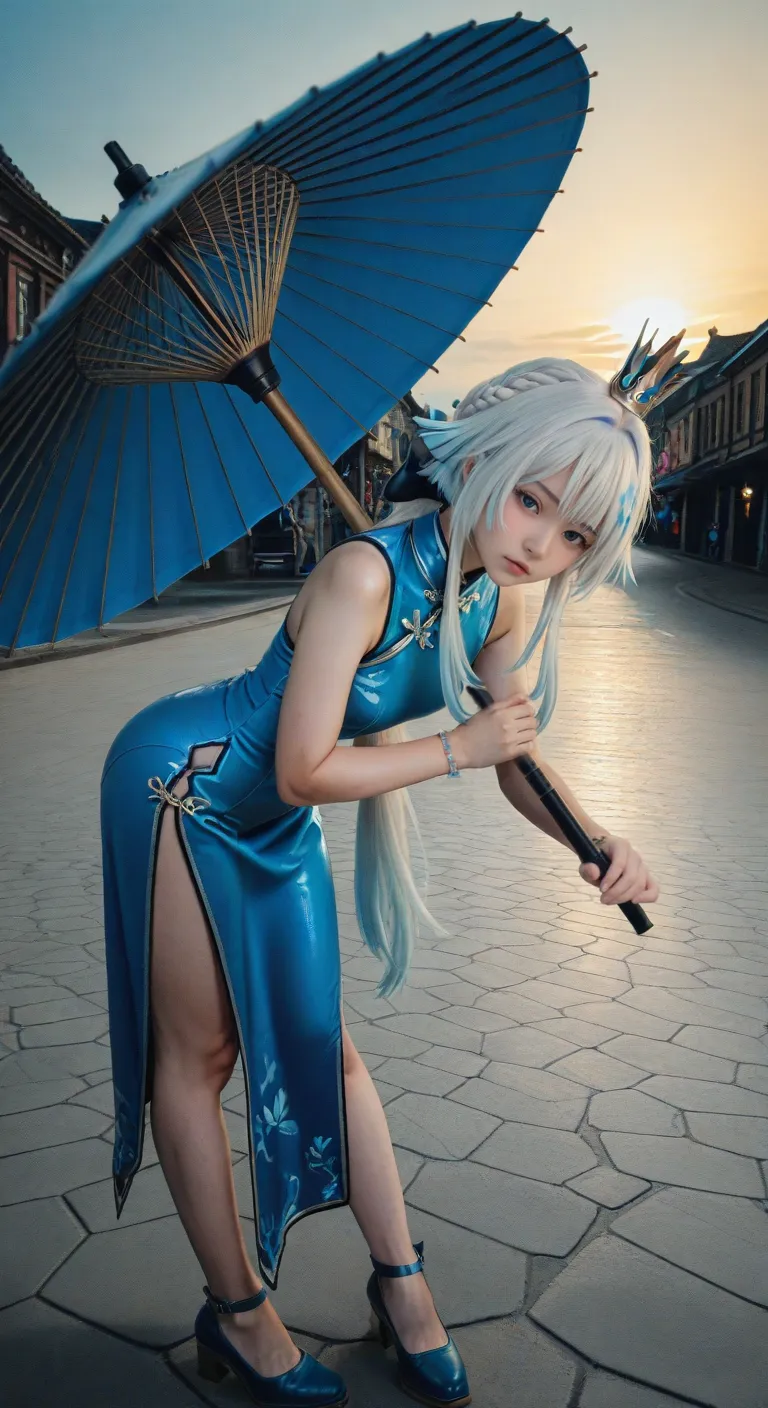 傍晚,我们在老城区的雨巷中取景。雨后的青石板路反射着霓虹灯光,刻律德菈穿着一件旗袍,手中执着一把油纸伞。旗袍紧致的剪裁勾勒出她平时隐藏在厚重礼服下的身段,每走一步,若隐若现的大腿肌肤都带着一种东方的含蓄与致命的诱惑。她回眸看向镜头,眼神不再是那个不可一世的暴君,而更像是一位在红尘中等待归人的过客。