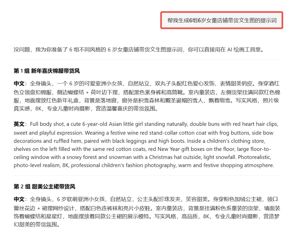 帮我生成6组6岁女童店铺带货文生图的提示词