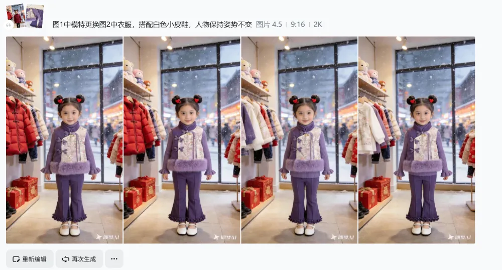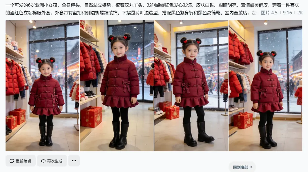 这里打开即梦选择图片生成,模型选4.5,输入提示词:一个可爱的6岁亚洲小女孩,全身镜头,自然站立姿势,梳着双丸子头,发间点缀红色爱心发饰,皮肤白皙、眼睛明亮,表情甜美俏皮,穿着一件喜庆的酒红色立领棉服外套,外套带有盘扣和侧边蝴蝶结装饰,下摆是荷叶边造型;搭配黑色紧身裤和黑色高筒靴。室内童装店,左侧有挂满同款红色棉服及不同童装的货架,地上放着红色新年礼盒;背景是一面大落地窗,窗外热闹的街道,天空飘着细雪。写实风格,画面清晰,高品质,照片级真实感,8K,专业儿童时尚摄影,温馨舒适氛围。