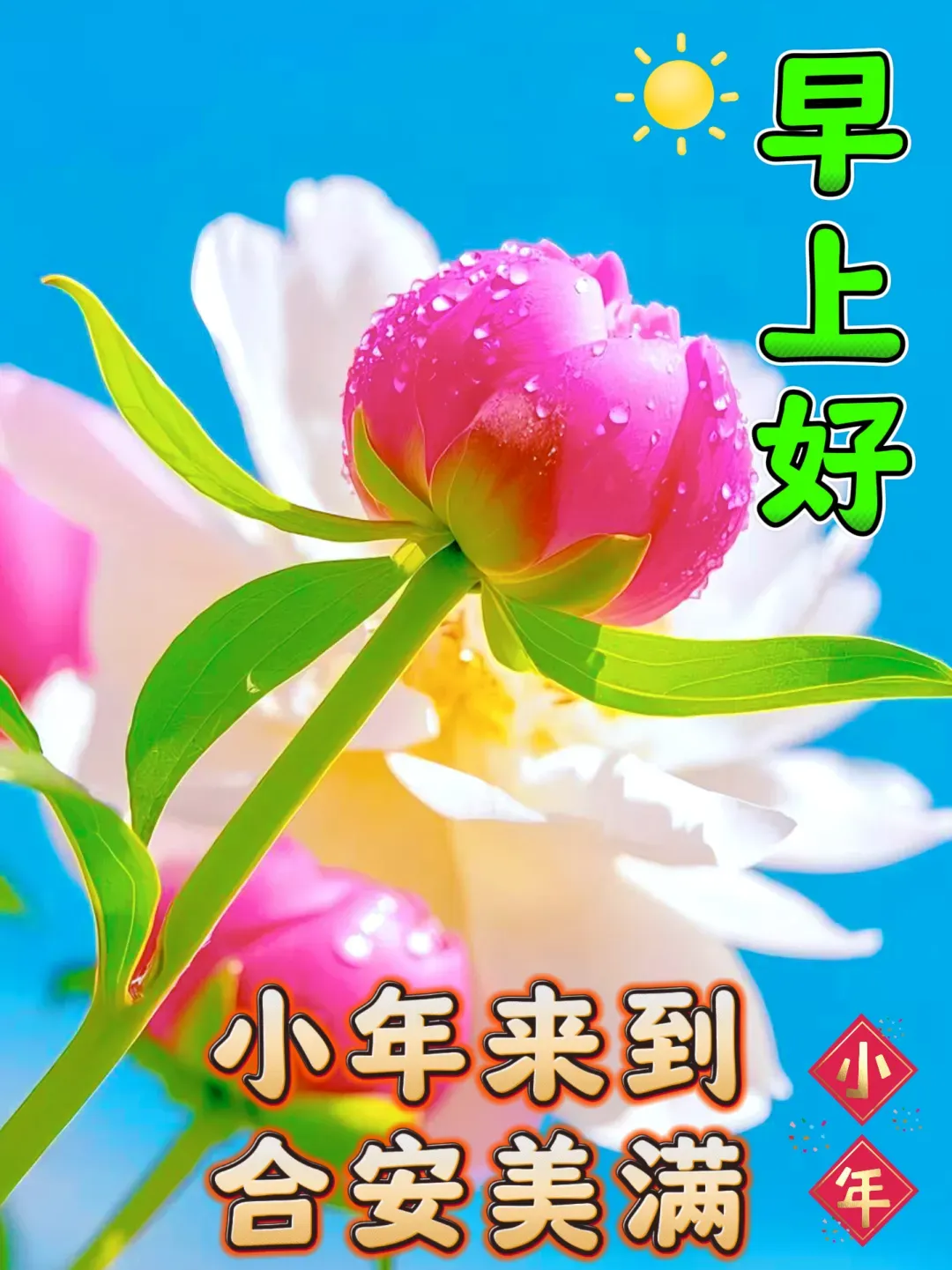 💐时光洒脱似流水,小年祝福满心头。☀岁月如歌绽芳华,拥抱幸福莺歌舞。🌹愿您岁月袋里装满喜悦,🌟心中种下希望的幸福种子。🌊🎶小年的祝福与您同行,🍉愿您收获满满的快乐收获!💐