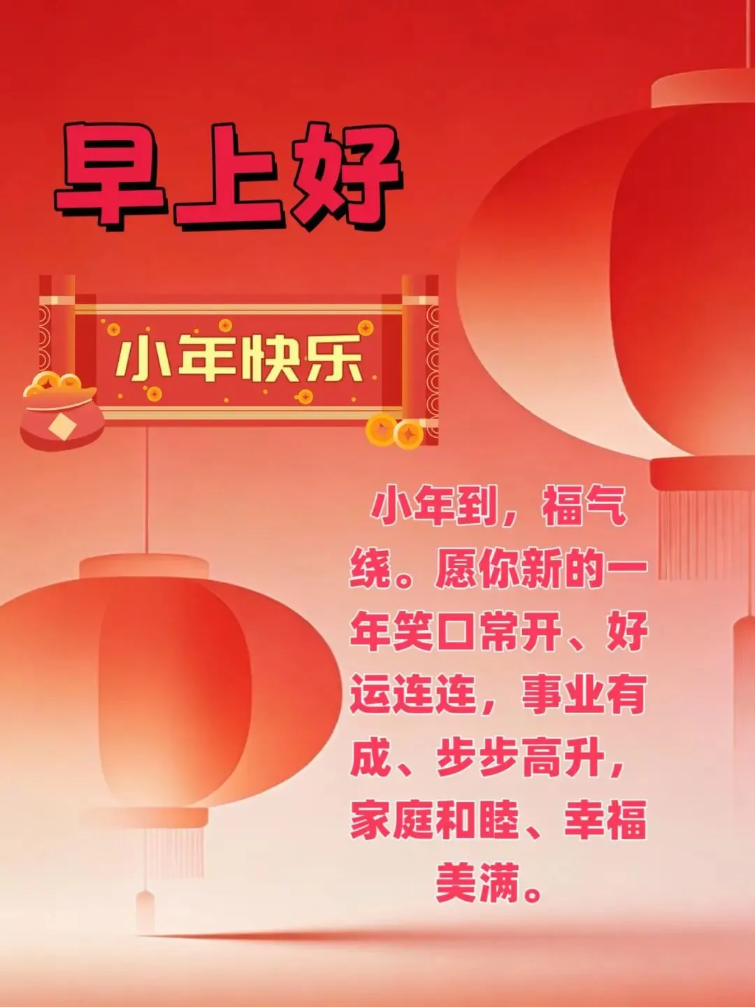 💕小年日子旺,天天进银行,🌸日日逛商场,票子花的爽,🌞礼物个个亮,人人神旺旺,🌹笑印在脸上,美放在心上,🌻礼捧在手上,祝挂在嘴上,💐祝你小年过得爽!🍀