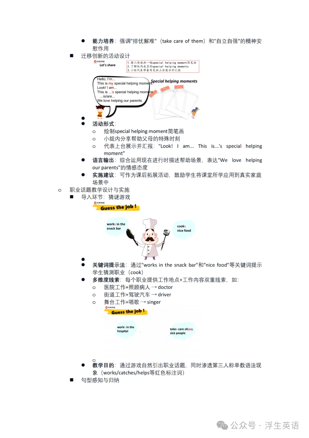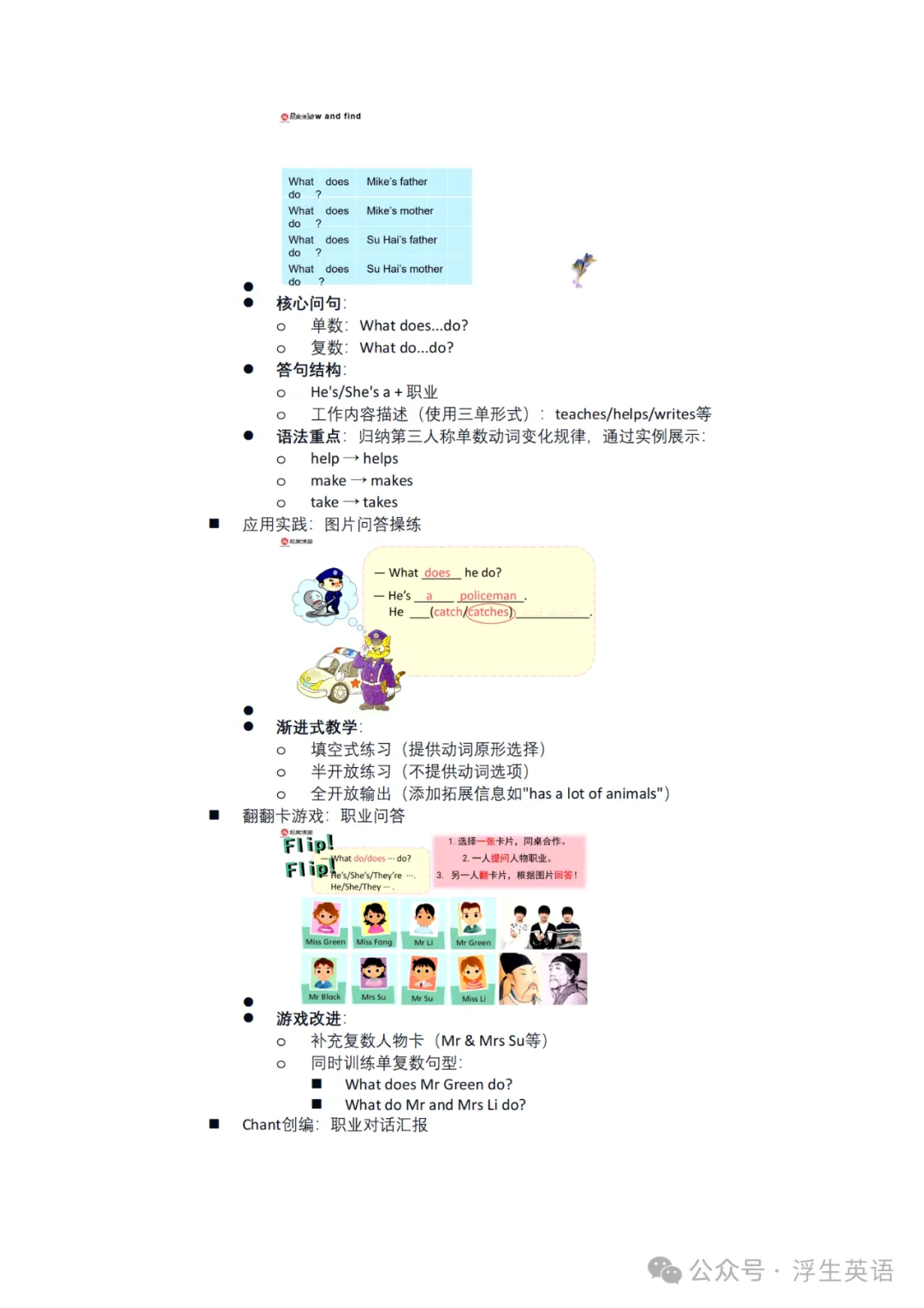 应用实践:图片两两问答(逐步放手填空)、翻翻卡游戏(补充复数情境)、绘本快问快答(拓展职业描述维度:工作地点、时间、意义等);
