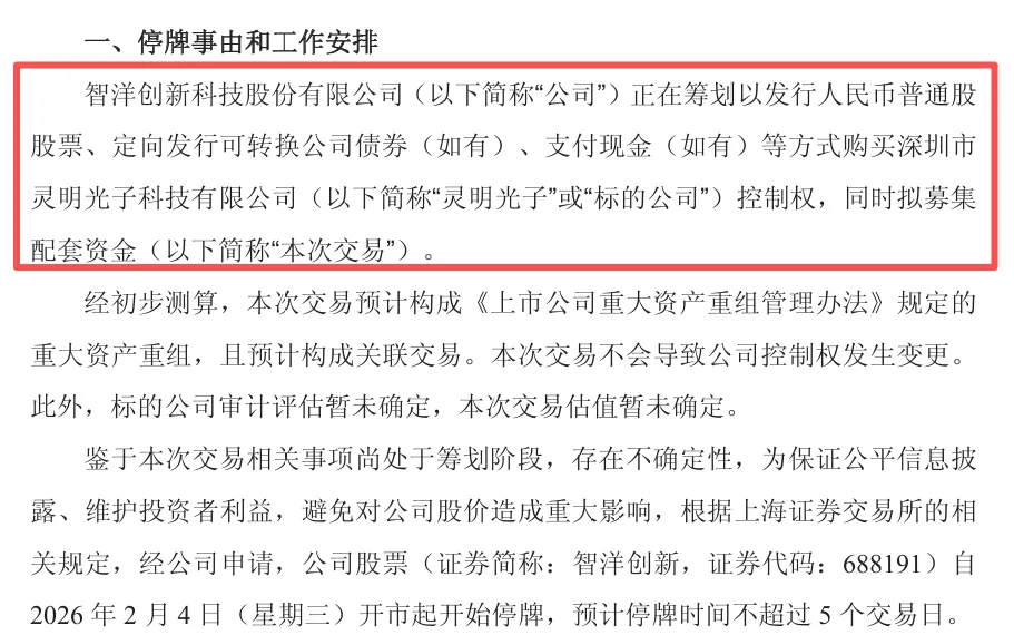 2026年2月3日晚间,科创板人工智能企业智洋创新(688191.SH)发布重大资产重组公告,公司拟通过发行股份、定向发行可转换公司债券及支付现金相结合的方式,收购深圳市灵明光子科技有限公司控制权,并同步募集配套资金。本次交易预计构成重大资产重组且涉及关联交易,公司股票自2月4日起停牌,预计不超过5个交易日