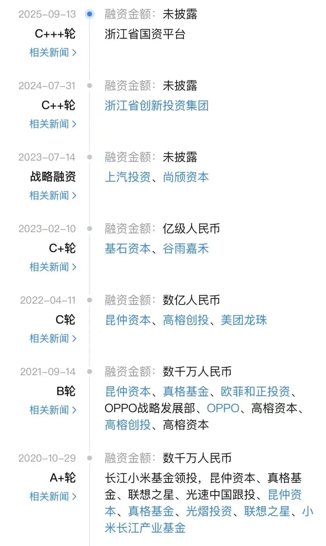 公司核心团队由斯坦福、北大、清华等院校博士领衔,创始人臧凯为斯坦福博士、北大校友,团队具备国际一流半导体与光电芯片研发经验,率先攻克3D堆叠工艺等行业关键难题,成为国内少数可稳定量产高性能SPAD面阵芯片的企业。技术壁垒叠加商业化落地能力,吸引资本密集加注:成立至今完成9轮融资,股东阵容包括真格、高榕、联想之星、小米产业基金、上汽投资、OPPO、基石资本、浙江国资等,2025年C3轮后估值突破40亿元,跻身硬科技独角兽行列。