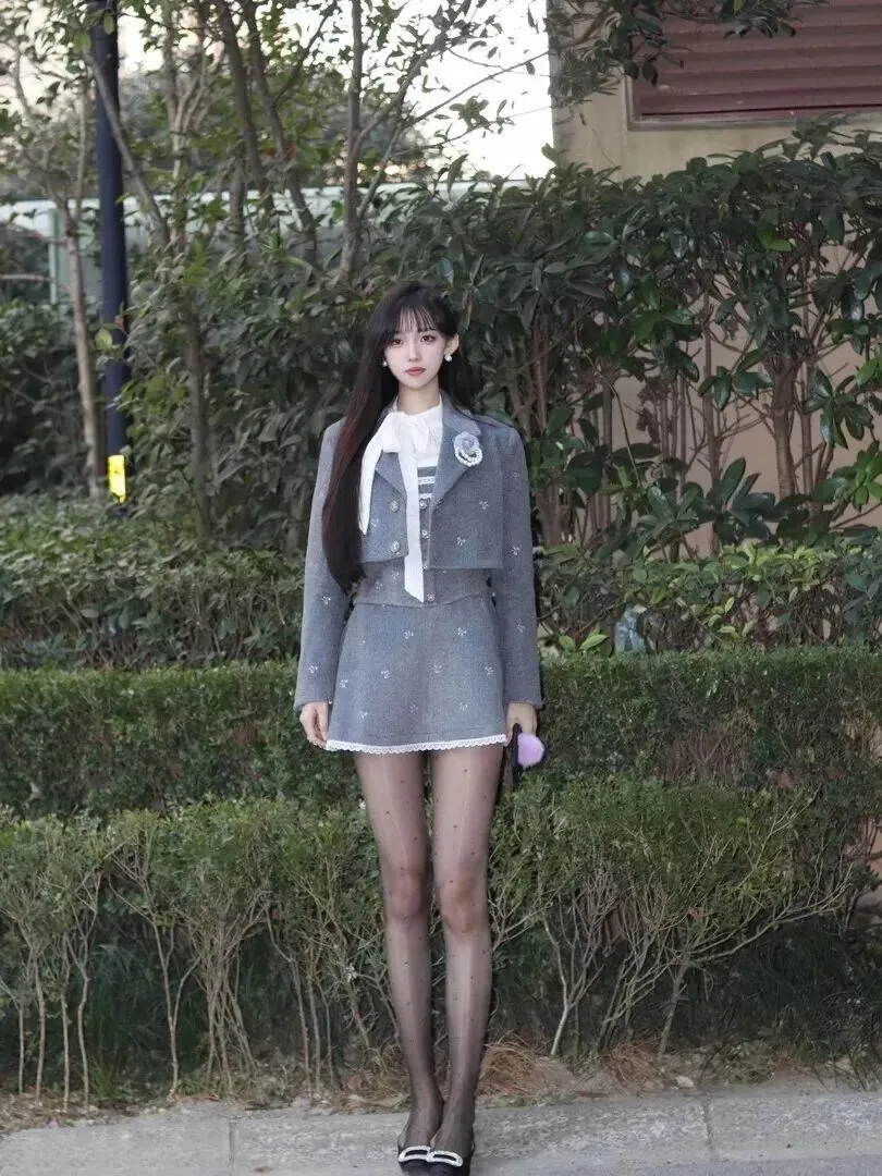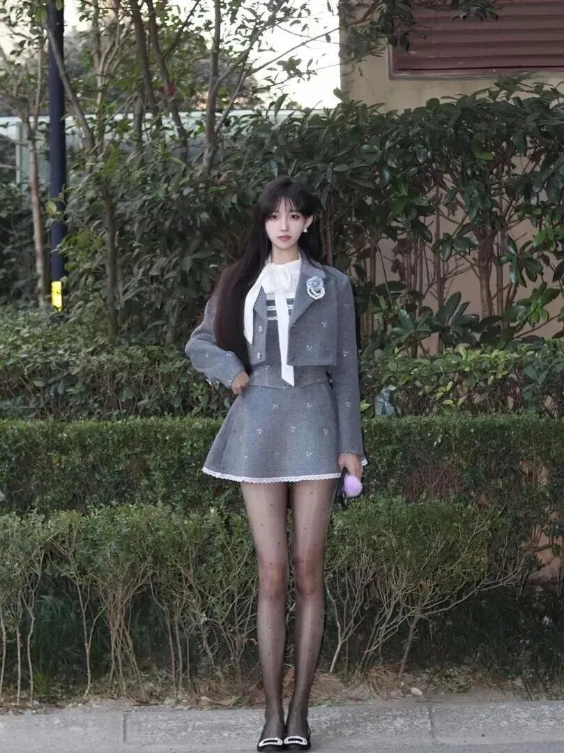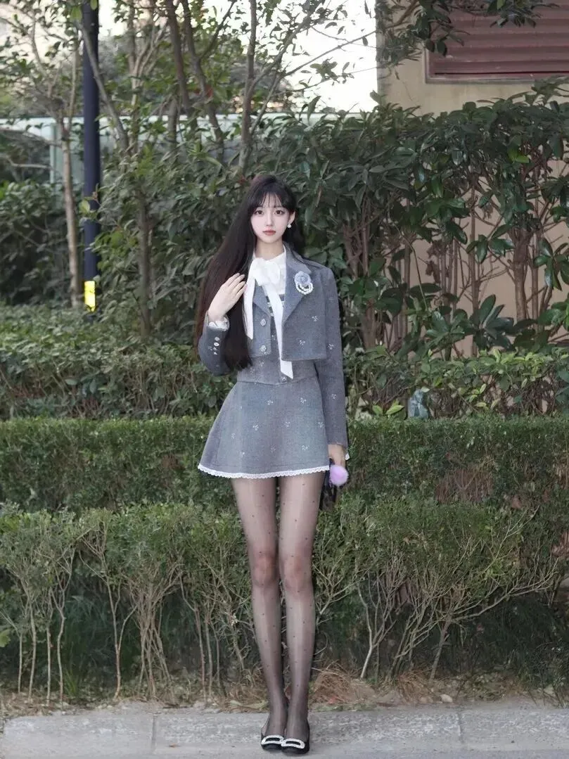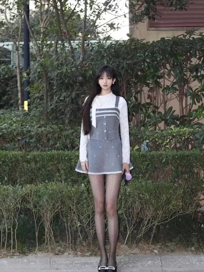 .子是A字.短款,.藏肉效果.一流。胯宽.腿粗的.姐妹.不用担.心,.这裙子.能修.饰得很.好。裙.边加了蕾丝.花边,.小小少女心.。灰.色西装配蕾.丝,刚.中带柔.。丝袜选了.黑色波点,.半透明材.质若隐若.现。冬天.穿不会冷,.还带点.小性.感。