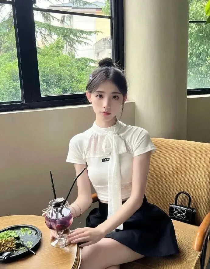 .晚了.也能五分.钟出.门!.米白.色针织短.袖+黑.色短.裙组合简单.不出错.,但领口.的飘带瞬.间让基础款.有了.设计感。.拎个迷你.黑色手.提包,长发.随意一披.,笑起来邻.家又治愈,.同事都问.你是不是偷.偷去学了穿.搭课.
