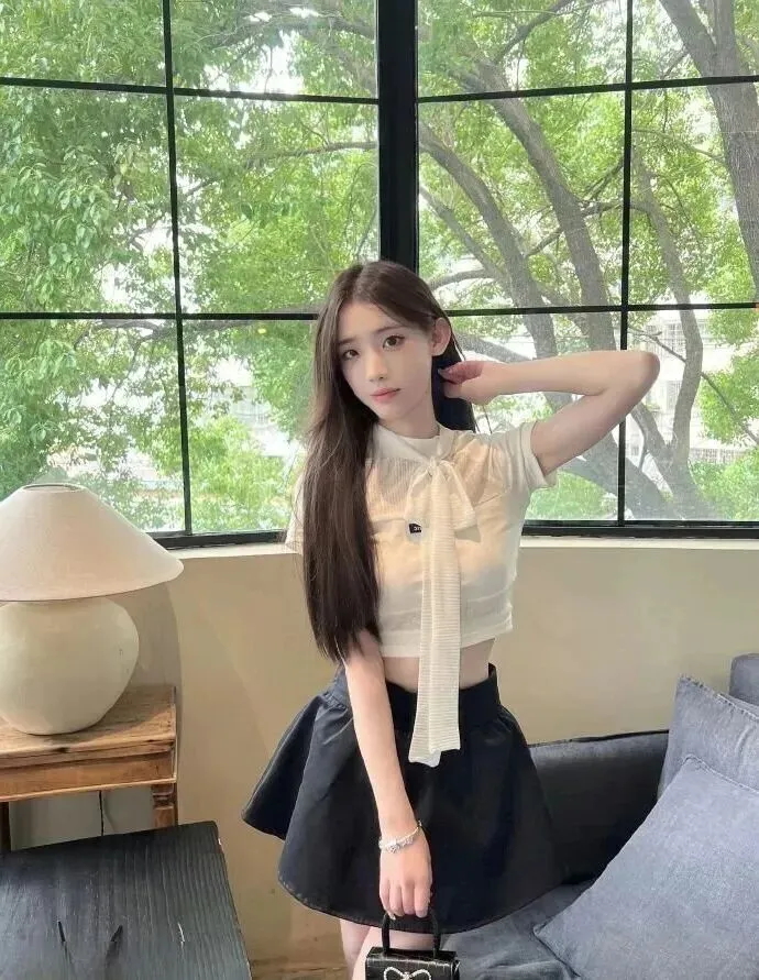.个高丸.子头,.整个.人立马.清爽.起来!白.色短款针.织上.衣特.别显瘦,.半高领加.上网纱.拼接,若隐.若现的感.觉刚刚好.。胸口的.小标贴.细节感.拉满,.衣服自.带的飘.带走路时随.风飘啊.飘,.超级灵.动。搭配黑.色高.腰短.裙,.腿长瞬间拉.高10.公分!.银色耳环.和手链一.戴,甜中.带酷,出门.直接.被闺.蜜夸.“像女团门.面”!