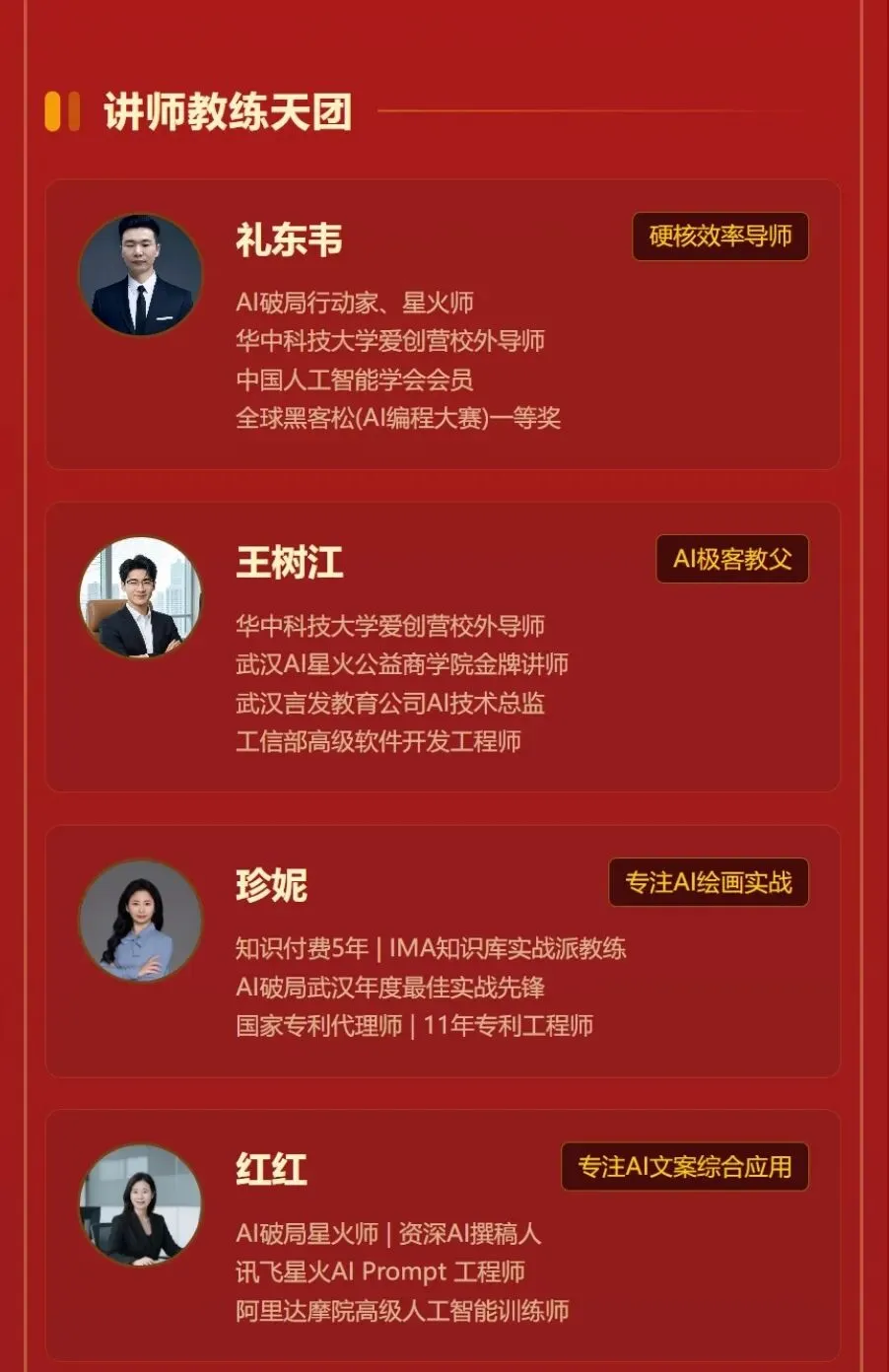 • 我们团队5位讲师多位老师去华科讲课,还有参加各种AI竞赛,最近做豆包特训营还被出版社邀请写豆包的书,把直播实操课程变成系统课程(权威认证的含金量!)