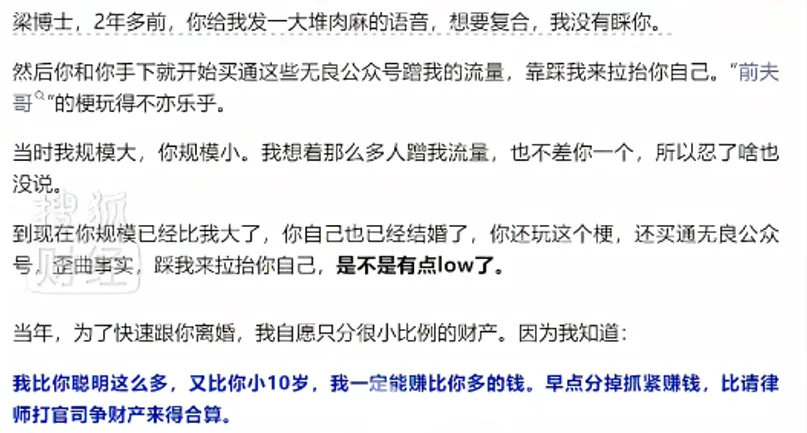此次李蓓公开怒怼前夫,核心诉求是不满梁文涛长期蹭其流量、靠踩低自己抬高身价。李蓓在文中爆料,2023年梁文涛事业处于最低谷时,曾向她发送大量肉麻语音寻求复合,被自己拒绝后,对方便开始指使手下及水军,通过无良公众号蹭其流量,炒作前夫哥梗,歪曲事实抹黑自己,文末更以“开直播讲故事”发出警告。