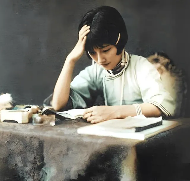 图中这位低头看书的叫陆小曼,短发用小发夹别着,袖口滚着细边,桌布旧旧的却铺得平整,她用手扶着太阳穴,像在把一段法语默背过一遍,这姿势我在外婆年轻时的黑白照里也见过,都是那种端着气定神闲的好看。
