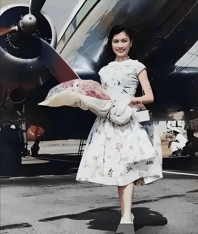 这个出现在机翼旁边的裙装女孩就是她,收腰大摆裙,提着花束从舷梯口走下来,笑得亮堂,风把裙边拨得有点飘,那个年代能和飞机同框,可把人羡慕坏了,朋友看了说这张像海报,我回他一句,这可是真人实景