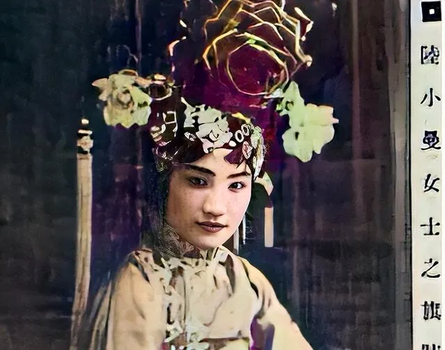 这张太有看头,头面大得像一座花山,枝叶叠上去,团簇着宝石亮片,戏服一穿人便不是原来的人,她坐正了,眼里却藏着玩味,那会儿她最爱热闹,台上台下都不愿错过。
