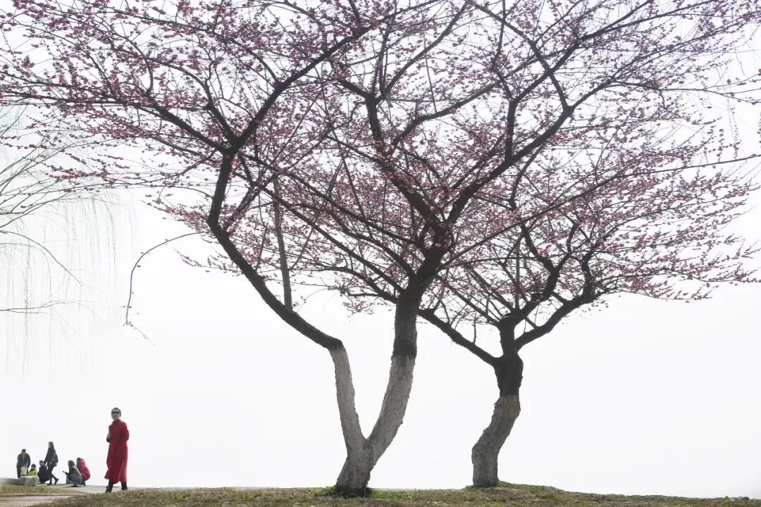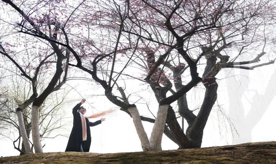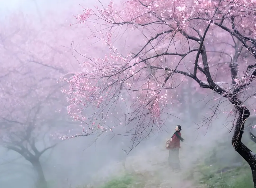 清晨的薄雾还未散尽,粉白的梅朵便已缀满枝头。约来的模特闭着眼,指尖轻触一朵盛放的粉梅,我采取后期叠加强调艺术氛围,侧逆光为她的发梢镀上一层金边,连呼吸都变得柔软。不远处,一位红衣女子提着裙摆走过,薄雾里的身影,像从旧画里走出来的人,我按下快门,把这瞬间的诗意定格。