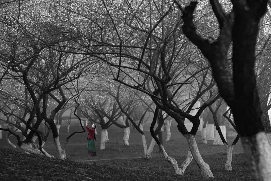 暮色渐浓时,我把镜头调成黑白。虬曲的枝干在暮色里更显苍劲,一位女子立于树下,抬手轻触花枝,黑白的影调里,少了色彩的喧嚣,多了几分沉静的力量。原来,梅园的美,从来不止于花的娇艳,更在于人与花相遇时,那些藏在光影里的故事与情绪。