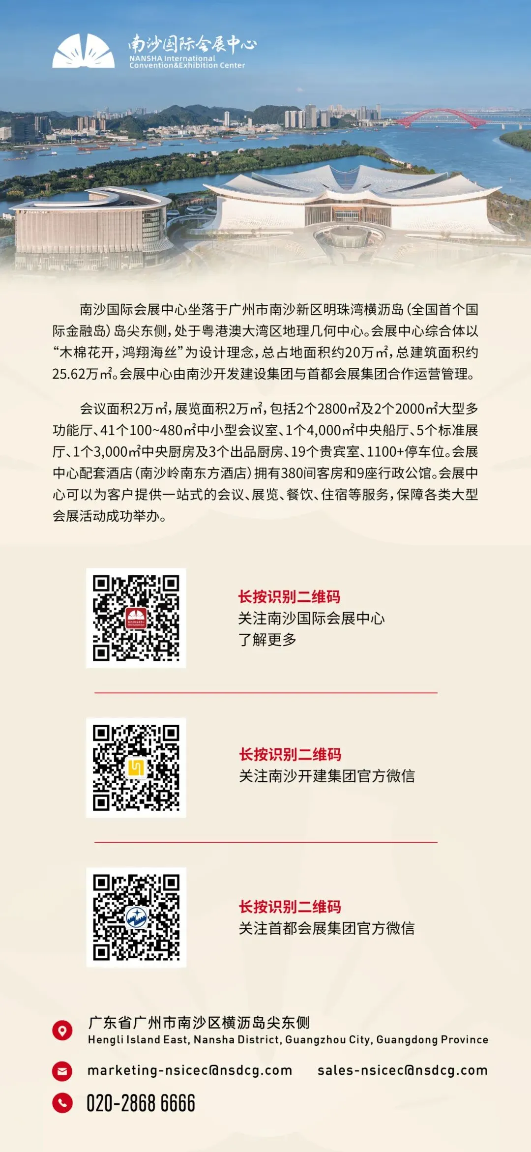 免责声明:本宣传文案所涉数据和图文信息仅供参考,精准信息以正式批文或签约文件为准。我们尊重创作,也注重分享。转发信息仅供参考如有偏差与谬误,请联系修改或删除;用户使用或无法使用本公众号平台传递的信息所造成的所有直接或间接损失,本公众号平台不承担任何法律责任。部分图片、视频来源于网络,如涉及侵权,请联系删除。在法律许可范围内,南沙国际会展中心享有最终解释权。