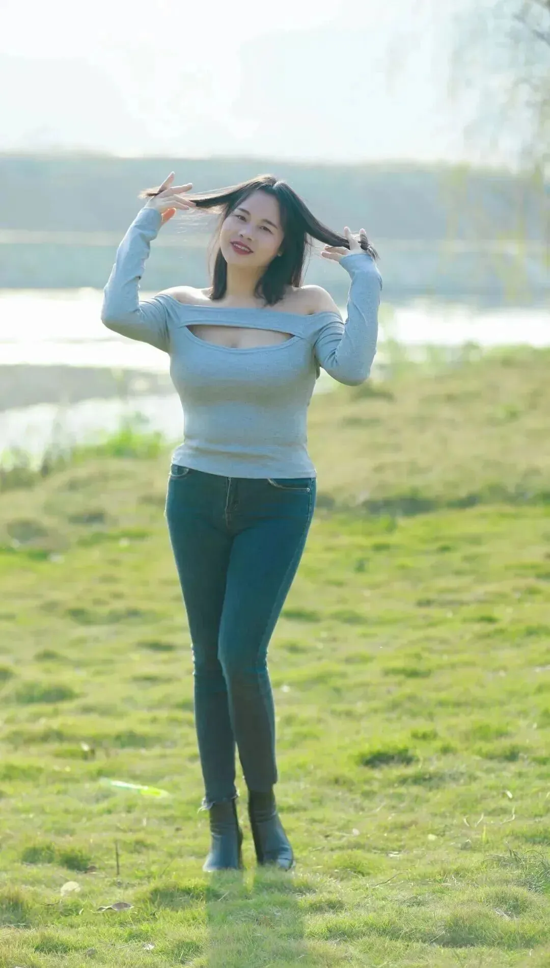 在公园里拍照时,找一处干净的草坪侧身坐下来,一只手将一侧头发别于耳后,另一只手旁撑,这样的姿势,非常适合穿牛仔裤拍照,既展现出了腿部线条,又上镜好看。