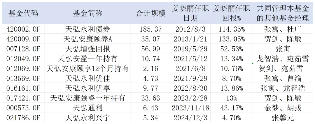 她的代表作天弘永利债,13个完整年度中11年正收益,任期回报超114%,固收+领域的标杆产品;
