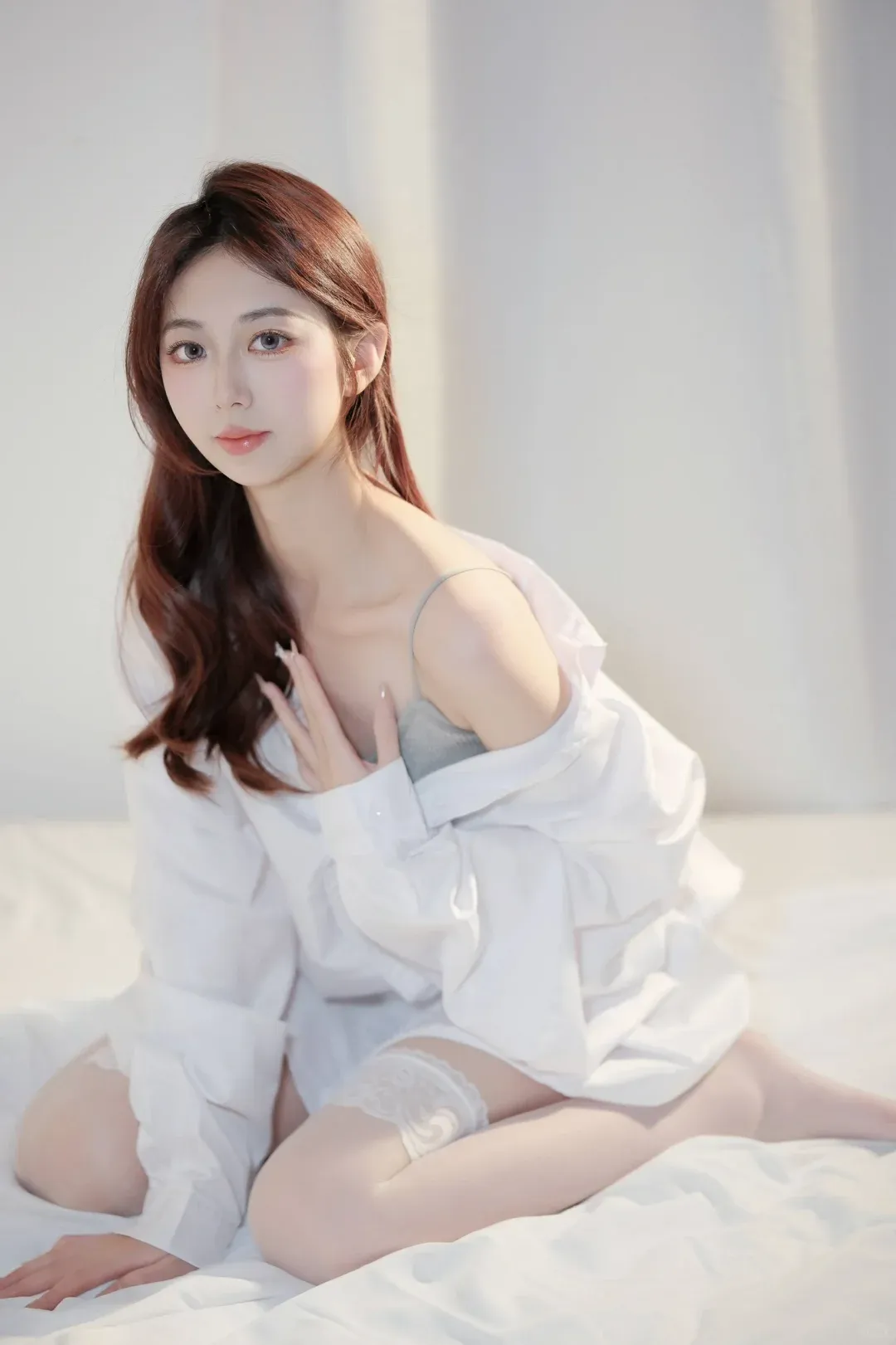 跪坐在床上,一手轻抚胸口,一手撑在身侧,身体微侧,眼神直视镜头,让衬衫轻轻滑落露出人物的肩线更显纯欲感。中景构图完整展现身体线条的同时,抚胸的拍照动作更显克制不刻意,纯欲感拉满。